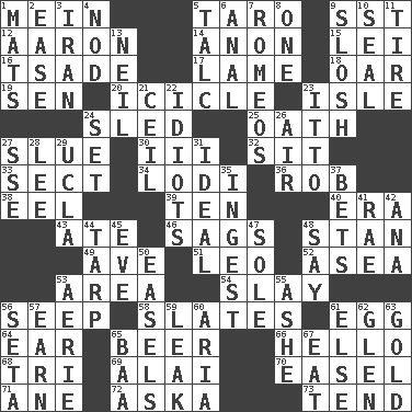 ACROSS 1. Count _ (2 wds.) 5. Edible starchy tuberous root 9. Fast jet (abbr.) 12. Composer Copland 14. Soon (poet.) 15. Flowery wreath 16. Sadhe (variant) 17. Unable to walk 18. Boat paddle 19. Elected rep. 20. Tapering mass of hanging ice 23. Capri or Wight 24. Downhill vehicle 25. Pledge 27. Change direction abruptly 30. One more than two 32. Be seated 33. Religious group 34. Farming town in central California 36. Director Reiner 38. Snakelike fish 39. Nine, plus one 40. Epoch 43. Had dinner 46. Droops 48. Comedian Laurel of Laurel & Hardy 49. "___ Maria" 51. Lion 52. Toward the sea 53. Type of rug 54. Kill 56. Ooze 58. Chalkboards 61. Ovum 64. Ewer handle 65. Fermented drink made from hops 66. Phone greeting 68. Three (prefix) 69. Mountain range southwest of Kyrgyzstan 70. Artist's stand 71. A saturated hydrocarbon 72. "____ silly question..." 73. Watch over DOWN 1. Floor coverings 2. Comfort 3. SW Asia republic 4. Allow head to fall sleepily 5. Baby powder 6. Of or related to the anus 7. Lover boys 8. Single 9. Make a splashing sound 10. Lick closed 11. Hoop that covers a wheel 13. Famous astronaut Armstrong 21. To provide with a ceiling 22. Foolish or stupid persons 23. "Tell ____ the Marines!" 24. Arrange properly for use 26. Atmosphere 27. Compass dir. 28. Area sheltered from the wind 29. Southern CA. univ. 31. Perfect 35. Swallow 37. Stakes 41. Actress Charlotte 42. Santa ___, CA 44. Canvas cover 45. First lady 47. Not divided or shared with others 48. Declare 50. Artist's stands 53. Nest on high 55. American tennis player Robert 56. Stalk of a moss capsule 57. Merit 59. Path through which fluid escapes 60. Roberta Peters solo 61. Otherwise 62. Small, secluded valley 63. Precious metal 65. Sound made by sheep 67. Consume