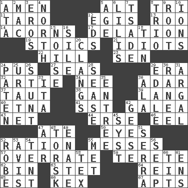 ACROSS 1. So be it 5. Keyboard modifier key 8. Three (prefix) 11. Pacific island yam 12. The front part of a cuirass 13. Friend of Pooh 14. Oak nuts 17. Accusation by an informer 19. Unemotional ones 21. Foolish or stupid persons 22. Land elevation 23. Elected rep. 24. Fluid product of inflammation 27. Oceans 29. Epoch 32. Nick name for Arthur 34. Born 36. The sixth month of the Jewish calendar 37. Pulled tight 38. Separate the seeds from cotton 39. Austrian-born American filmmaker Fritz 40. Inactive volcano in Sicily 41. Fast jet (abbr.) 42. An organ shaped like a helmet 43. Remaining after all deductions 44. Celtic language 46. Snakelike fish 47. Had dinner 50. Snake ____ (dice throw) 52. Food allowance for one day 55. Makes clutter 57. Make much ado about nothing 59. Cylindrical with tapered ends 62. Storage container 63. Proofreading order 64. It's straight from the horse's mouth 65. Eastern Standard Time (abbr.) 66. A weed 67. Flats, for short DOWN 1. _ moment's notice (2 wds.) 2. Apple computer (short form) 3. Greek god of love 4. _ pole 5. Personal question 6. Ms. Damita and namesakes 7. Sadhe (variant) 8. Musical group of three 9. Carrot, for example 10. Charged particles 12. Begley and Asner 15. Annoying sound 16. Filth; sediment 18. Shallow baking pan 20. Gives out a loud, resonant sound 24. Eucharist need 25. A salt of uric acid 26. Difficult or unusual or dangerous feat 28. Gospel singer Marvin 29. Peak District village in England 30. The wife of a rajah (variant) 31. Therefore, facetiously 33. Call ___ day 35. Main course 36. Chicken ___ king 42. Honkers 45. System (abbr.) 47. Atmosphere 48. Cod relative 49. Related on the mother's side 51. Father Junipero _ 52. Loose flowing garment 53. Opinion 54. Portable shelter 55. Was introduced to 56. Ooze 58. John Ritter's dad 60. Teat (slang) 61. Followers of ems