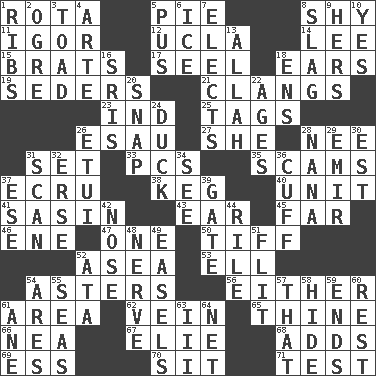ACROSS 1. Round or rotation of duties 5. Sliced dessert 8. Like a shrinking violet 11. Composer Stravinsky 12. Southern CA. univ. 14. Area sheltered from the wind 15. Naughty children 17. Sew up the eyelids of hawks and falcons 18. Hearing organs 19. Spring feasts 21. Rings loudly 23. Working for oneself (abbr.) 25. Labels 26. He sold his birthright 27. A female animal or person 28. Born 31. Arrange properly for use 33. Personal Computers (abbr.) 35. Fraudulent business schemes 37. Shade of tan 38. Barrel 40. A single undivided whole 41. Indian antelope 43. Hearing organ 45. Distant 46. Compass dir. 47. Single 50. Small quarrel 52. Toward the sea 53. Pipe bend 54. Michaelmas daisies 56. One or the other 61. Type of rug 62. Distinctive style or manner 65. One or ones belonging to thee 66. Teachers' org. 67. Writer Wiesel 68. Does sums 69. Double-curved letter 70. Be seated 71. Trial DOWN 1. Chest bones 2. Legendary monster 3. Frog relative 4. Johnson of "Laugh-In" 5. Fluid product of inflammation 6. Frozen water 7. Opts 8. Volcanic refuse 9. Possessive pronoun 10. It is so 13. Assad's deity 16. Indian titles of respect 18. Followers of ems 20. Fastener 22. Grows older 24. Evade 26. Needle holder 28. Nanny 29. Independent ruler or chieftain 30. Eastern Standard Time (abbr.) 31. Glance over 32. Celtic language 34. Observe 36. _ links 37. Compass dir. 39. Yard entry 42. Sense of smell 44. Cause heat under the collar 48. Impudent aggressiveness 49. Artist's stands 51. Secret move to avoid paying debts 52. _ moment's notice (2 wds.) 54. Ancient Greek god of war 55. Oceans 57. Not this but _ 58. Flintstone garb 59. Extremities 60. Remainder 61. One (Scot) 63. One more than two 64. Remaining after all deductions