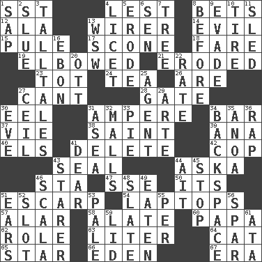 ACROSS 1. Fast jet (abbr.) 4. For fear that 8. Antes 12. Chicken ___ king 13. One who wires 14. Morally bad or wrong 15. Whimper 17. Biscuitlike quick bread 18. Conductor's collection 19. Shoved, as through a crowd 21. Worn away 23. Small child 24. Afternoon social gathering 26. "We ___ not amused" (Victoria) 27. Patter 28. Yard entry 30. Snakelike fish 31. Electrical Unit 34. Drinking establishment 37. Compete 38. Virtuous person 39. Santa ___, CA 40. Raised railways 41. Erase 42. Police officer (slang) 43. Lick closed 44. "____ silly question..." 46. R.R. building 47. Compass dir. 50. It is 51. Fortification 54. Portable computers 57. Having or resembling wings 58. Having winglike extensions 60. Dad 62. Hero or heavy, e.g. 63. 61 cubic inches 64. Feline 65. Play the lead 66. Locale of original sin 67. Epoch DOWN 1. Plant excrement 2. Change direction abruptly 3. Baron Munchausen's specialties 4. It is permitted: Lat. 5. Eat (away) 6. Elected rep. 7. Family _ (genealogy) 8. Prior to 9. Dodge 10. Become fatigued 11. Downhill vehicle 13. Compass dir. 16. Inky black, to poets 20. Baseball player Mel 22. Assign a rank or rating to 25. Representative 27. To provide with a ceiling 29. Johnson of "Laugh-In" 30. First lady 31. Toward the sea 32. Promenades 33. Sliced dessert 34. Keyboard key 35. Small Philippine buffalo 36. Strike 41. Letter starter 43. A viewer who gazes fixedly 44. Small island 45. Discontinue 46. Any of the three canals of the cochlea 48. Schedule 49. Consumed 51. Hearing organs 52. Groove 53. Light colored 55. For each 56. Practice fight 59. Hat (slang) 61. "One Day ___ Time"