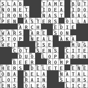 ACROSS 1. Thick slice 5. Not wild 9. Yet 12. Music written for nine 14. The main thing one is thinking about 15. Wedding promise 16. Metal shackles 17. Political cartoonist Thomas 18. Paper or plastic container 19. Writing instrument 20. Michaelmas daisies 23. Spanish pot 24. Bowlike part 25. Singer Brickell 27. Armed conflicts 30. "We ___ not amused" (Victoria) 32. Male offspring 33. Discontinue 34. Be tempered by heat 36. Alias (abbr.) 38. Dripping 39. Compass dir. 40. Large cup 43. Small bed 46. Elected reps. 48. Quote 49. Superhero pair 51. Trim (branches) 52. Arabian gulf 53. Fermented drink made from hops 54. Frolic 56. Possessive pronoun 58. Keyboard key 61. Compass dir. 64. Chief or king in Benin or Nigeria 65. Actor Lugosi 66. Relating to or accompanying birth 68. Car dealer's back yard 69. Precipitation 70. Plays smoothly or legato 71. Followers of ems 72. Cassini of fashion 73. Louse (plural) DOWN 1. Sever or remove by pinching or nipping 2. Old wives' tales, e.g. 3. At once, immediately (arch.) 4. Benjamin's nick name 5. Prong on a fork 6. The sixth month of the Jewish calendar 7. Makes clutter 8. Erode 9. Instruction Manual for Humans 10. Freehold land 11. Ancient Roman robe 13. Russian ruler of old 21. Skim 22. Trios 23. Pig sound 24. Cleo's killer 26. ___ good deed 27. Compass dir. 28. Had dinner 29. College mil. group 31. Artist's stand 35. Poe poem 37. Among 41. Shoshoni 42. Commissioned mil. rank 44. Lyric poems 45. Third day of the wk. 47. Blemish 48. Head covering 50. Severe or trying experience 53. Naughty children 55. Not women's 56. Opening into or through something 57. Inky black, to poets 59. Writer Wiesel 60. Long (Scottish) 61. Needle case 62. Drug cop 63. Otherwise 65. Sis' sibling 67. Everything
