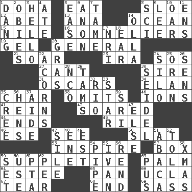 ACROSS 1. Capital of the state of Qatar 5. Erode 8. A type of plum 12. Collude with 13. Santa ___, CA 14. Sea 15. "Death on the ____" 16. Wine waiters 19. Set 20. Commissioned military rank 21. Fly high 23. Lyricist Gershwin 24. Distress signal 27. Patter 30. Beget 31. Motion picture awards 34. Flair 35. Burn to charcoal 38. Leaves out 40. Charged atoms 41. It's straight from the horse's mouth 42. Flew 44. Conclusions 45. Cause heat under the collar 46. Compass dir. 47. Observe 50. Narrow board 53. Stimulate to action 57. Gift holder 59. Supplying deficiencies 63. Inside of hand 64. First name in cosmetics 65. Baking dish 66. Southern CA. univ. 67. Lacerate 68. Conclude 69. Backtalk DOWN 1. Mild oath, euphamism for damn 2. Off-Broadway awards 3. Phone greeting 4. Had dinner 5. Relaxation 6. At once, immediately (arch.) 7. Docile 8. _-fi 9. Area sheltered from the wind 10. Boat paddle 11. Followers of ems 14. Water jar 17. Medical imaging device (abbr.) 18. Ewer handle 20. Pate de foie ____ 22. Oak nuts 24. Grain storage tower 25. NW Algerian seaport 26. Elected reps. 28. Non-commissioned officer (abbr.) 29. Scottish caps 30. A glass for beer 32. _ de Janeiro 33. Play the lead 35. Algonquian 36. Coop moms 37. Helper 39. Indian title of respect (Mr.) 43. Otherwise 47. Filth; sediment 48. Compass dir. 49. Eastern Standard Time (abbr.) 51. Phillipine bananalike plant 52. For Whom the Bell _____ 54. Corncob 55. "Terrible" tsar 56. Tear apart 58. Dec. holiday 59. Arrange properly for use 60. Purpose 61. Parent Teacher Association (abbr.) 62. For each 63. Product of festering