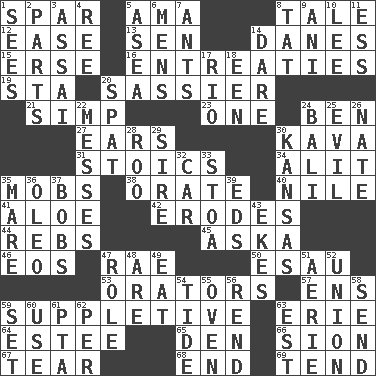 ACROSS 1. Coast Guard woman 5. Housemaid (var.) 8. Falsehood 12. Relaxation 13. Elected rep. 14. Natives or inhabitants of Denmark 15. Celtic language 16. Pleas 19. R.R. building 20. More disrespectful 21. Simple or foolish person 23. Single 24. Benjamin's nick name 27. Hearing organs 30. Polynesian shrub of the pepper family 31. Unemotional ones 34. Came down and settled, as after flight 35. Disorderly crowds 38. Speak pompously 40. Mediterranean tributary 41. Medicinal plant 42. Eats (away) 44. Confederate soldiers (slang) 45. "____ silly question..." 46. Greek goddess of the dawn 47. Actress Charlotte 50. Son of Isaac 53. Speakers 57. Followers of ems 59. Supplying deficiencies 63. One of the Great Lakes 64. First name in cosmetics 65. Lair 66. The Jewish people; Israel 67. Separate forcefully 68. Conclude 69. Look after DOWN 1. Observes 2. Pieces 3. Slender Brazilian palm 4. To separate or throw off 5. At sea 6. Not women's 7. Pismires 8. Make lace 9. Cuckoo 10. Area sheltered from the wind 11. Curvy letter 14. Have the gumption 17. _ de Janeiro 18. Car or cant ending 20. Argument over a trivial matter 22. Makes clutter 24. Indonesian resort city 25. Morally bad or wrong 26. Nathan's nickname 28. Friend of Pooh 29. Beget 30. Sunflower state 32. 4-wheeled motor vehicle 33. Portico 35. Female horse 36. Butter sub 37. Moves up and down 39. Begley and Asner 43. Supplements with great effort 47. Hero or heavy, e.g. 48. "We ___ not amused" (Victoria) 49. Consume 51. Nest on high 52. The state of being joined or united 54. Event that recurs at intervals 55. Baking chamber 56. Tear apart 58. Transmit 59. Arrange properly for use 60. Purpose 61. Parent Teacher Association (abbr.) 62. For each 63. Eastern Standard Time (abbr.)