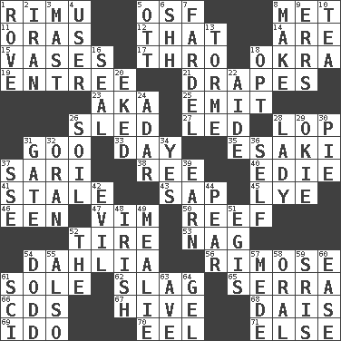 ACROSS 1. Tall New Zealand timber tree 5. Order of Saint Francis (abbr.) 8. Was introduced to 11. Mouths or openings 12. Not this but _ 14. "We ___ not amused" (Victoria) 15. Flower holders 17. Through, poetically 18. Gumbo ingredient 19. Main course 21. Window treatments 23. Alias (abbr.) 25. Send forth 26. Downhill vehicle 27. Directed 28. Chop off 31. Thick or sticky substance 33. 24 hours 35. 1973 Nobel Price Winner (Physics) Leo 37. Indian skirt 38. To riddle 40. Singer Brickell 41. Lacking originality or spontaneity 43. Plant excrement 45. Potassium hydroxide 46. Car or cant ending 47. Zeal 50. Coral collection 52. Become fatigued 53. Tired old horse 54. A pale violet or amethyst color 56. Full of chinks, cracks, or crevices 61. Not divided or shared with others 62. Volcanic refuse 65. Father Junipero _ 66. Music discs 67. Hub of activity 68. Raised platform 69. Wedding promise 70. Snakelike fish 71. Otherwise DOWN 1. Be footloose 2. SW Asia republic 3. Vertical spar for supporting sails 4. One who uses or employs something 5. Baseball player Mel 6. Quiet! 7. Burden 8. Cause to be 9. Blunders 10. Afternoon social gathering 13. Singer Mel 16. Lick closed 18. Elect 20. Made supply last 22. Assistant 24. The sixth month of the Jewish calendar 26. Earth 28. Kenny Rogers chart-topper in '80 29. Migrant worker of the '30s 30. Sliced dessert 31. Yard entry 32. NW Algerian seaport 34. Affirmative reply 36. Automatically 37. Compass dir. 39. Merit 42. Tending to cause great harm 44. Lightbulb-shaped fruit 48. From or relating to Ireland 49. Ear of corn 51. Armor plate that protects the chest 52. Definite Article 54. Texas town _ City 55. In addition 57. Ancient Persian 58. Of the mouth 59. Indian titles of respect 60. Comfort 61. _-fi 63. "___ Maria" 64. Set