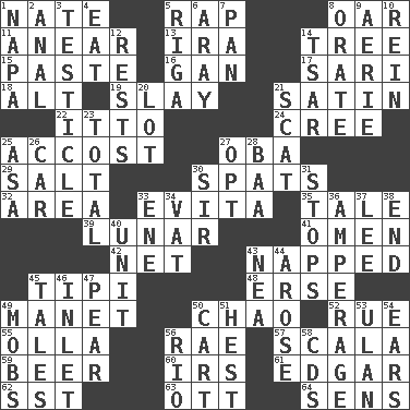 ACROSS 1. Nathan's nickname 5. Hit sharply and swiftly 8. Boat paddle 11. Approach 13. Retirement account (abbr.) 14. Relationship diagram 15. Thick mixture 16. Separate the seeds from cotton 17. Indian skirt 18. Keyboard modifier key 19. Kill 21. Smooth fabric 22. "Tell ____ the Marines!" 24. Algonquian 25. Buttonhole 27. Chief or king in Benin or Nigeria 29. Table seasoning 30. Arguments over trivial matters 32. Type of rug 33. Webber/Rice musical 35. Falsehood 39. Type of eclipse 41. Sign of something about to happen 42. Remaining after all deductions 43. Slept 45. Native american tent (variation) 48. Celtic language 49. French painter Edouard 50. US Secretary of Labor Elaine L. _ 52. Sorrow 55. Water jar 56. Actress Charlotte 57. Any of the three canals of the cochlea 59. Fermented drink made from hops 60. Big collection agency 61. _ Allan Poe 62. Fast jet (abbr.) 63. Baseball player Mel 64. Elected reps. DOWN 1. California wine valley 2. Of or related to the anus 3. One of the two male reproductive glands 4. Consume 5. Port city in Latvia 6. Like ___ of sunshine 7. Baking dish 8. Declaim 9. Nest on high 10. It's straight from the horse's mouth 12. Musical pauses 14. Russian ruler of old 20. Car dealer's back yard 21. Leave at once 23. Add up to 25. White ___ sheet 26. Auto 27. Choose 28. Sound made by sheep 30. Title for a knight 31. Closes up, plugs up 33. Compass dir. 34. Large container 36. Electrical Measurement 37. Area sheltered from the wind 38. Conclude 40. A single undivided whole 43. Teachers' org. 44. Came up 45. Lies 46. An arm off of a larger body of water 47. Lightbulb-shaped fruit 49. Crowds into 50. Haul 51. Behest 53. Uhlan (variant) 54. Hearing organs 56. River (Sp.) 58. Music discs