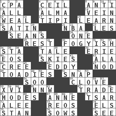 ACROSS 1. Accounting whiz (abbr.) 4. To provide with a ceiling 8. Opposed to 12. Everything 13. _ mater 14. Distinctive style or manner 15. Welt 17. Native american tent (variation) 18. Memorize 19. Smooth fabric 21. Basketball assoc. 23. French article 24. Actors Connery and Penn 26. Single 28. Take ten 30. Out of fashion; old fashioned 34. R.R. building 37. Story 39. 4th largest of the Great Lakes 40. Greek goddess of the dawn 41. Atmospheres 43. According to 44. Algonquian 46. Whirlpool 47. Dreamland 48. Sycophants 51. Fastener 54. "Barney Miller" actor Jack 55. Garlic unit 58. 16 61. Compass dir. 63. Buy and sell 65. Methods 67. Singer Murray 71. Russian ruler of old 72. Toward shelter 73. Vintage cars 74. Raised railways 75. Comedian Laurel of Laurel & Hardy 76. Sty mamas 77. Observe DOWN 1. Crow sounds 2. Entreaties 3. Having winglike extensions 4. Domesticated feline 5. Biblical high priest 6. Mischievous child 7. (Had) reclined 8. "___ Maria" 9. Be tempered by heat 10. Become fatigued 11. Lodging establishments 16. One who doesn't tell the truth 18. Long (Scottish) 20. Compass dir. 22. Sometimes accompanies a hiss 25. Fast planes 27. Sight organ 29. Receives possession of 30. Gives food to 31. SW Asia republic 32. Grain storage tower 33. Froth on beer 34. Religious group 35. "Corrida" creature 36. Toward the sea 38. Hat (slang) 42. Synchronize (abbr.) 45. Begley and Asner 49. Charged particles 50. A really long time 52. The first octave above the treble staff 53. Sweet dark-red dessert wine 56. Flower holders 57. Peak District village in England 58. Dec. holiday 59. Electrical Unit 60. The main thing one is thinking about 62. Armed conflicts 64. Celtic language 66. Car or cant ending 68. Modern: prefix 69. At this time 70. Double-curved letter