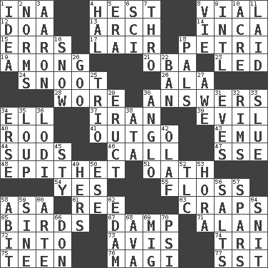 ACROSS 1. _ tizzy (2 wds.) 4. Command 8. Small bottle 12. ___ good deed 13. Bowlike part 14. South American Indian 15. Blunders 17. Den 18. _ dish (used to culture cells) 19. Amid 21. Chief or king in Benin or Nigeria 23. Directed 24. Snob 26. Chicken ___ king 28. Had on 30. Responses 34. Pipe bend 37. SW Asia republic 39. Morally bad or wrong 40. Friend of Pooh 41. Outlay 43. Australian flightless bird 44. Soap bubbles 46. Give a ring to 47. Compass dir. 48. Curse 51. Pledge 54. Affirmative reply 55. Soft thread for cleaning between teeth 58. White ___ sheet 61. To separate or throw off 63. Dice game 65. Avian creatures 67. Moist 71. ____ Jay Lerner 72. To the inside or interior of 73. Advice 74. Three (prefix) 75. Adolescent 76. Wise men 77. Fast jet (abbr.) DOWN 1. It may be bright or harebrained 2. Typical standards 3. Composer Copland 4. Actor Linden 5. Epoch 6. _-fi 7. Through, poetically 8. Compete 9. International (abbr.) 10. Measure of real estate 11. Put down 16. Overwhelm 18. Friends 20. Thick or sticky substance 22. Prohibit 25. Musical group of three 27. Deep reverence 29. Spew [out] 30. White American of non-Hispanic descent 31. Nights before holidays 32. Basketball hoops 33. Change direction abruptly 34. Celtic language 35. Central Nebraska county 36. Farming town in central California 38. "One Day ___ Time" 42. Norwegian king 45. Filthy place 49. Possessive pronoun 50. Compass dir. 52. Affectionate concern, for short 53. Israeli folk dance 56. Table seasonings 57. Practice fights 58. "This won't hurt ____!" 59. Trig term 60. Johnson of "Laugh-In" 62. Dutch treat 64. In a ____ (agitated or irritated) 66. Spanish title 68. Actress Gardner 69. Russian fighter aircraft 70. 23rd letter of the Greek alphabet