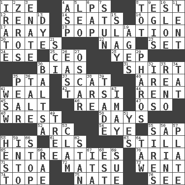 ACROSS 1. Ending with capital 4. High mountains 8. Trial 12. Tear apart 14. Theater features 16. Stare 17. Like ___ of sunshine 18. Census information 20. Hauls 22. Tired old horse 23. Arrange properly for use 24. Compass dir. 25. Corporate head (abbr.) 28. Slangy assent 30. Prejudice 31. Upper-body garment 35. Parent Teacher Assoc. 37. Leave at once 40. Length times width 41. Welt 42. Tarsus (plural) 44. Monthly bill 45. Table seasoning 46. 480, 500 or 516 sheets of paper 47. Bear (Spanish) 48. Take or capture by force 50. 24-hour periods 52. Curve 54. Sight organ 55. Plant excrement 58. Part of HMS, perhaps 61. Raised railways 63. Free from disturbance or agitation 65. Pleas 70. Roberta Peters solo 71. Portico 72. Taiwanese island in East China Sea 73. Left 74. Drink excessively 75. Nathan's nickname 76. Observe DOWN 1. Feeling or showing extreme anger 2. Nothings 3. Maternal 4. Cleo's killer 5. Lion 6. Infant food 7. Make senseless or dizzy 8. Small child 9. The front part of a cuirass 10. _ gin 11. Portable shelter 13. Color 15. Kill 19. Eras 21. _-fi 26. 90 degrees 27. Witty Wilde 29. N Egypt peninsula 30. Greek mezzo-soprano Agnes 32. Angers 33. Western Nevada city 34. Make lace 35. Lightbulb-shaped fruit 36. Lie 38. "We ___ not amused" (Victoria) 39. Sadhe (variant) 41. Compass dir. 43. "If ____ say so..." 49. Relationship diagram 51. Consenting reply 53. Dollar (slang) 55. Founders of families 56. Place in a line 57. Food holder 58. Behest 59. To the inside or interior of 60. Obstruct or block passage 62. Comedian Laurel of Laurel & Hardy 64. The 23rd letter of the Hebrew alphabet 66. Actress Charlotte 67. Call ___ day 68. Eastern Standard Time (abbr.) 69. Take to court