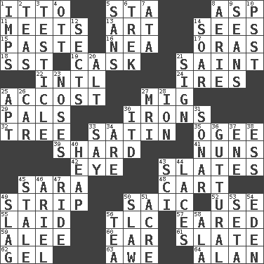 ACROSS 1. "Tell ____ the Marines!" 5. R.R. building 8. Viper 11. Confronts 13. Tate display 14. Observes 15. Thick mixture 16. Teachers' org. 17. Mouths or openings 18. Fast jet (abbr.) 19. Keg 21. Virtuous person 22. International (abbr.) 24. Angers 25. Buttonhole 27. Russian fighter aircraft 29. Friends 30. Removes the wrinkles 32. Relationship diagram 33. Smooth fabric 35. Double curve, resembling the letter S 39. Broken piece 41. Religious women 42. Sight organ 43. Chalkboards 45. "Two Mules for Sister ____" 48. Draw slowly or heavily 49. Long narrow piece of something 50. Ketch in the Levant 52. Purpose 55. Put down 56. Affectionate concern, for short 57. Having ears or earlike features 59. Toward shelter 60. Ewer handle 61. Schedule 62. Set 63. Deep reverence 64. ____ Jay Lerner DOWN 1. Naughty children 2. Afternoon social gatherings 3. A testis 4. Baseball player Mel 5. Without 6. Long journey 7. _ moment's notice (2 wds.) 8. Nest on high 9. Actors Connery and Penn 10. Inconspicuous attention getter 12. Religious groups 14. Fly high 20. Keyboard modifier key 21. Signal 23. Olfactory organs 25. Fitting 26. Auto 27. Medical imaging device (abbr.) 28. Electrically charged atom 30. It would 31. Echolocation 33. Declare 34. "We ___ not amused" (Victoria) 36. From the throat 37. Compass dir. 38. Double-curved letter 40. Pile 43. _-fi 44. Shoestrings 45. Showing deterioration from age 46. Satellite of Uranus 47. Travel on or in a vehicle 49. Volcanic refuse 50. Cole _ (cabbage dish) 51. 1/640 square mile 53. Bristle 54. Genesis locale 56. Afternoon social gathering 58. Wing