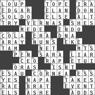 ACROSS 1. Central Nebraska county 5. Drink excessively 9. Lyricist Gershwin 12. _ Allan Poe 14. Liveliness 15. Spanish title 16. Twentieth part of a lira 17. Otherwise 18. Keyboard modifier key 19. Attempt to accomplish something 20. Actresses Bloom and Felton 23. "______ My Girl" (Turtles hit) 24. Ancient Persian 25. Inside; within (prefix) 27. Root beer relative 30. Epoch 32. Heredity factor (abbr.) 33. Like ___ of sunshine 34. Religious women 36. Make supply last 38. Scottish cap 39. Fish or hair follower 40. Mountains (abbr.) 43. Fenced enclosure 46. "Two Mules for Sister ____" 48. One who doesn't tell the truth 49. Corporate head (abbr.) 51. Strike 52. Needle holder 53. Mouths or openings 54. Is not 56. Son of Isaac 58. Pupil covering 61. Double-curved letter 64. Consenting reply 65. California wine valley 66. Proceeds 68. Actress Charlotte 69. Naughty child 70. Incident 71. Raised railways 72. American tennis player Robert 73. Sums up DOWN 1. For fear that 2. Aroma 3. Unsightly 4. Writing tablet 5. Adolescent 6. Spanish pot 7. Went by 8. Compass dir. 9. Potato state 10. Hero or heavy, e.g. 11. Pismires 13. Be footloose 21. Genesis locale 22. Summer TV shows 23. Neighbor of Neb. 24. Can I? 26. Compass dir. 27. Feline 28. Mouth or opening 29. Desk light 31. Approach 35. Put through a sieve 37. Give off 41. The 19th letter of the Greek alphabet 42. Indian title of respect (Mr.) 44. Shade of tan 45. Teachers' org. 47. Domed church section 48. Allow 50. Motion picture awards 53. Fertile tracts in a desert 55. Nathan's nickname 56. Jane of fiction 57. Lick closed 59. Brightly colored fish 60. Pace 61. Made supply last 62. Transmit 63. Fast planes 65. Basketball assoc. 67. Actress Gardner