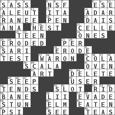 ACROSS 1. Backtalk 5. Overdraft (abbr.) 8. Compass dir. 11. Native American of Southwest Alaska 13. Call ___ day 14. The sixth month of the Jewish calendar 15. The wife of a rajah (variant) 16. Writing instrument 17. Raised platform 18. Santa ___, CA 19. Behest 21. Cell (Danish) 22. Adolescent 24. Washington bills 25. Worn away 27. For each 29. Indian skirt 30. Wear away 32. Trial 33. Make _____ (do battle with) 35. Root beer relative 39. Any of the three canals of the cochlea 41. Baking chamber 42. Tate display 43. Keyboard key 45. Ooze 48. One who makes use of a thing 49. Looks after 50. Notch 52. To free from 55. Object of repulsion 56. Cards in a Roman deck? 57. Dodge 59. Surprise greatly 60. Shade tree 61. Consumed 62. 23rd letter of the Greek alphabet 63. Observe 64. Afternoon social gatherings DOWN 1. "Two Mules for Sister ____" 2. Actor Alda or Thicke 3. Legislators 4. Institute legal proceedings 5. Cuts off 6. Proofreading order 7. Avid follower 8. Peak District village in England 9. Travels by water 10. Celtic language 12. Giggle 14. Arabian gulf 20. Conclude 21. Drawstring 23. Proofreads 25. Eastern Standard Time (abbr.) 26. Actress Charlotte 27. Adept person 28. A really long time 30. Epoch 31. Learning spot: Fr. 33. Armed conflict 34. Keyboard modifier key 36. Make much ado about nothing 37. Allow 38. A saturated hydrocarbon 40. Smile enhancers 43. Superhero pair 44. First name in cosmetics 45. Theater features 46. World-weariness 47. Genesis locale 49. Cook's measure (abbr.) 50. Filth; sediment 51. Citrus frut 53. The main thing one is thinking about 54. Habitations of wild animals 56. French article 58. Large container