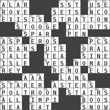 ACROSS 1. Having or resembling wings 5. Fast jet (abbr.) 8. Purpose 11. Be footloose 12. Puts into a specified state 13. Non-commissioned officer (abbr.) 14. Is 17. Ski resort town in Vermont 19. Moe Howard, for one 21. Foolish or stupid persons 22. Coast Guard woman 23. Animal enclosure 24. Cleo's killer 27. Greek god of love 29. Personal Computers (abbr.) 32. Seines 34. Shoshoni 36. Relating to the mouth 37. Story 38. Afternoon social gathering 39. Trig term 40. Small island 41. Consenting reply 42. Wanderer 43. Marina Del _, California 44. San ____ (Riviera town) 46. Raised railways 47. Auto club (abbr.) 50. Austrian-born American filmmaker Fritz 52. A viewer who gazes fixedly 55. Michaelmas daisies 57. Characterized by complete cowardliness 59. Flight of steps 62. Everything 63. Body of Kaffir warriors 64. Expressions of contempt or scorn 65. Teachers' org. 66. Erode 67. Frozen precipitation DOWN 1. "We ___ not amused" (Victoria) 2. Brine-cured salmon 3. Deliberation 4. Musical pauses 5. Arrange properly for use 6. Remove all contents or possession from 7. Sadhe (variant) 8. To (old English) 9. Highlander 10. Immeasurably long periods of time 12. Compass dir. 15. Drinks excessively 16. Fly high 18. Metal container 20. Sulky 24. Being in motion 25. Gospel singer Marvin 26. Friendly 28. Navigate 29. First class 30. Lessep's creation 31. Bobsleighs 33. Born 35. Artist's stands 36. Bear (Spanish) 42. Music written for nine 45. Floor coverings 47. Tate display 48. Nest on high 49. Scent 51. Seizes 52. Connect, as a bridge 53. Lacquered or enameled metalware 54. Silent film actress Nazimova 55. Black tropical American cuckoo 56. The Jewish people; Israel 58. Elect 60. Friend of Pooh 61. Compass dir.