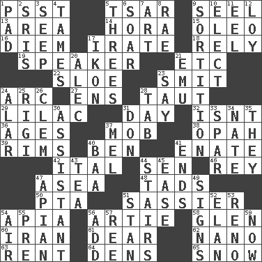 ACROSS 1. Inconspicuous attention getter 5. Russian ruler of old 9. Sew up the eyelids of hawks and falcons 13. Type of rug 14. Israeli folk dance 15. Butter sub 16. South Vietnam president (1954) 17. Feeling or showing extreme anger 18. Trust 19. Orator 21. And so on (abbr.) 22. _ gin 23. Stricken, poetically 24. Curve 27. Followers of ems 28. Strained 29. Pale purple color 31. 24 hours 32. Is not 36. Eras 37. Crowd into 38. Brightly colored fish 39. Basketball hoops 40. Benjamin's nick name 41. Related on the mother's side 42. Slanted text style (abbr.) 44. Elected rep. 46. Marina Del _, California 47. At sea 48. Bits 50. Parent Teacher Association (abbr.) 51. More impudent 54. Capital of Western Samoa 56. Nick name for Arthur 58. Small, secluded valley 60. SW Asia republic 61. Letter starter 62. Billionth: prefix 63. Monthly bill 64. Habitations of wild animals 65. Frozen precipitation DOWN 1. Groovy apt. 2. Indian titles of respect 3. Ooze 4. Makes less strong or intense 5. Threesomes 6. Fly high 7. Tate display 8. Actress Charlotte 9. Drawing lots 10. Opt 11. Snakelike fish 12. Myrna of the movies 17. Picture 20. Actor Baldwin 21. Australian flightless bird 23. Declare 24. Having or resembling wings 25. Swiss mountan, "Queen of the Mountains" 26. Clement's nick name 28. Bar bill 30. Aide 31. Spanish title 33. Coast Guard woman 34. Nathan's nickname 35. Those people 37. Cartoonist voice _ Blanc 40. Sound made by sheep 41. Conclusions 43. Afternoon social gathering 44. Flight of steps 45. Comfort 47. Bee-related 49. Attaches a signature 51. Comedian Laurel of Laurel & Hardy 52. Liveliness 53. Former U.S. Attorney General Janet 54. Atmosphere 55. Before (prefix) 56. Find the sum of 57. To riddle 59. Immediately