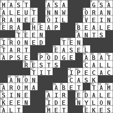 ACROSS 1. Vertical spar for supporting sails 5. White ___ sheet 8. Girls' org. (abbr.) 11. Native American of Southwest Alaska 13. Compass dir. 14. Northwest Algerian city 15. Indian princess (variant) 16. Lubricate 17. Distinctive style or manner 18. Epoch 19. Pile 21. Memphis, Tenn. Street 22. Adolescent 24. Pismires 25. Pressed 27. "___ Little Indians" 29. Small pie 30. Artist's stand 32. Domed church section 33. Puddle 35. Blind as ____ 39. Musical pauses 41. Give a ring to 42. Teat (slang) 43. Medicinal drug used to evoke vomiting 45. Soon (poet.) 48. Keg 49. Odor 50. Collude with 52. Scottish cap 55. Trig term 56. Wind 57. Peak District village in England 59. Peachy ____! 60. Binary compound 61. Thermoplastic polyamide 62. Keyboard modifier key 63. Was introduced to 64. Makes supply last DOWN 1. Female horse 2. Having or resembling wings 3. Elected representatives 4. Third day of the wk. 5. Small Philippine buffalo 6. Sever or remove by pinching or nipping 7. Leather borer 8. Relatively large 9. Moves on water 10. Singer Murray 12. Giggle 14. Baking chamber 20. Conclude 21. Object of repulsion 23. Keyboard key 25. Call ___ day 26. Strike 27. Label 28. Compass dir. 30. Begley and Asner 31. Shoestrings 33. Air pressure measure (abbr.) 34. Baseball player Mel 36. Sass 37. Wing 38. Affectionate concern, for short 40. Inactive volcano in Sicily 43. Frozen water 44. Eucharist need 45. Satellite of Uranus 46. Music written for nine 47. Sign of things to come 49. "____ silly question..." 50. Helper 51. Cy Young winner Saberhagen 53. _ vera 54. Not women's 56. Direct toward a target or goal 58. Color