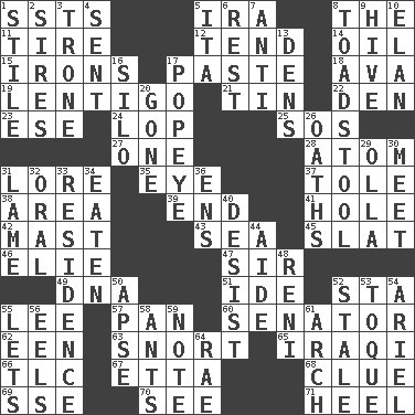 ACROSS 1. Fast planes 5. Retirement account (abbr.) 8. Definite Article 11. Hoop that covers a wheel 12. Watch over 14. Petroleum 15. Metal shackles 17. Thick mixture 18. Actress Gardner 19. Small, flat, pigmented spot on the skin 21. Shallow baking pan 22. Lair 23. Compass dir. 24. Trim (branches) 25. Distress signal 27. Single 28. Tiny particle 31. Old wives' tales, e.g. 35. Sight organ 37. Lacquered or enameled metalware 38. Type of rug 39. Conclude 41. Hollow 42. Vertical spar for supporting sails 43. Ocean 45. Narrow board 46. Writer Wiesel 47. Title for a knight 49. Heredity factor (abbr.) 51. Binary compound 52. R.R. building 55. Area sheltered from the wind 57. Baking dish 60. Elected representative 62. Car or cant ending 63. Derisive sound 65. Resident of Iraq 66. Affectionate concern, for short 67. Singer James 68. A slight indication 69. Compass dir. 70. Observe 71. Person who is morally reprehensible DOWN 1. Vertical member of a panel or frame 2. Titles for men of rank and authority 3. Marketplace scale 4. Posted 5. Call ___ day 6. State of inaction 7. Opposed to 8. Inedible or poisonous agaric 9. Hub of activity 10. Style 13. Hiding places for outlaws 16. Grain storage tower 17. Wimpy's pal 20. Went 26. Expletives 29. Spanish pot 30. Confront 31. Unable to walk 32. Spoken 33. Dwelling 34. Consumed 36. Followers of ems 40. Cease 44. Assistant 48. Painter Guido (1575-1642) 50. Domed church section 52. Lacking originality or spontaneity 53. Woman's close-fitting hat 54. Satellite of Uranus 55. Allows 56. Snakelike fish 58. Pismires 59. Short letter 61. Bowlike part 64. Actress Charlotte