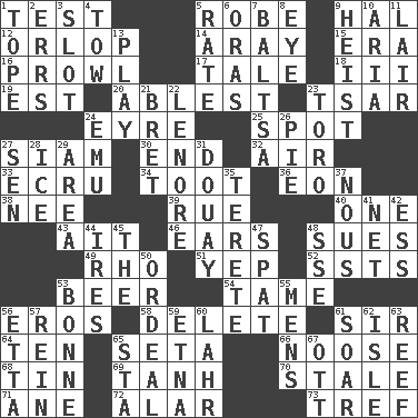ACROSS 1. Trial 5. Loose flowing garment 9. Actor Linden 12. Fourth or lowest deck 14. Like ___ of sunshine 15. Epoch 16. Move like a hungry wolf 17. Falsehood 18. One more than two 19. Eastern Standard Time (abbr.) 20. Most capable 23. Russian ruler of old 24. Jane of fiction 25. Blemish 27. Thailand, formerly 30. Conclude 32. Atmosphere 33. Shade of tan 34. A blast of a horn 36. Period of immesurable duration 38. Born 39. Sorrow 40. Single 43. Small island 46. Hearing organs 48. Institutes legal proceedings 49. 17th letter of the Greek alphabet 51. Slangy assent 52. Fast planes 53. Fermented drink made from hops 54. Docile 56. Greek god of love 58. Keyboard key 61. Title for a knight 64. "___ Little Indians" 65. Bristle 66. Trap for birds or small mammals 68. Shallow baking pan 69. Hyperbolic tangent 70. Having lost freshness 71. A saturated hydrocarbon 72. Having or resembling wings 73. Unclean, religiously DOWN 1. Drink excessively 2. Blunders 3. Notch 4. Pull behind 5. Pace 6. Mouths or openings 7. Greek mezzo-soprano Agnes 8. Sight organ 9. Robbery 10. Operatic vocal solo 11. Den 13. Frolic 21. Cy Young winner Saberhagen 22. Poe poem 23. "Corrida" creature 24. Australian flightless bird 26. Sliced dessert 27. Elected rep. 28. Frozen water 29. Type of rug 31. A city in N France, SE of Calais 35. Cylindrical with tapered ends 37. Horse sense 41. Fish or hair follower 42. Curvy letter 44. Angers 45. Definite Article 47. Petty quarrel 48. Compass dir. 50. Severe or trying experience 53. Child's nurse 55. Not women's 56. Singer James 57. It's straight from the horse's mouth 59. Inactive volcano in Sicily 60. Cowardly lion portrayer 61. Fly high 62. Small island 63. Coral collection 65. R.R. building 67. Baseball player Mel