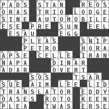 ACROSS 1. Groovy apts. 5. Comedian Laurel of Laurel & Hardy 9. Vintage cars 13. Mouths or openings 14. Musical group of three 15. Inn 16. Trig term 17. Car 19. Compass dir. 20. Before (prefix) 21. Player for Phoenix 22. Snakelike fish 23. Son of Isaac 25. Ovum 26. Entreaties 30. Sever or remove by pinching or nipping 34. Stone: prefix 35. Israeli folk dance 36. Domed church section 39. Cell (Danish) 42. SW Asia republic 43. California wine valley 44. Middle Eastern gold or silver currency 46. The sixth month of the Jewish calendar 47. Unconcealed 48. Mayday 51. Russian ruler of old 54. Institute legal proceedings 57. Direct toward a target or goal 58. Area sheltered from the wind 60. Hat (slang) 62. Interpreter 65. Whirlpool 66. Fertile tracts in a desert 67. Printing process, for short 68. Peachy ____! 69. Entreaty 70. It was, poetically 71. Celtic language DOWN 1. Introduce or present, as a question 2. Originate 3. Natives or inhabitants of Denmark 4. Compass dir. 5. Play the lead 6. Loyal 7. Small island 8. Trap for birds or small mammals 9. Director Reiner 10. Singer Brickell 11. Stare 12. Sew up the eyelids of hawks and falcons 15. Having great length 18. Large cup 20. Whimper 24. Seem 27. And so on (abbr.) 28. "We ___ not amused" (Victoria) 29. Twentieth part of a lira 30. Upper-body garments 31. Not either 32. Lyricist Gershwin 33. Baking dish 36. Santa ___, CA 37. Groovy apt. 38. Health resort 40. 54 in ancient Rome 41. Compass dir. 45. Johnson of "Laugh-In" 48. Backtalk 49. Lubricate 50. Don Adams' spy role 52. Tree or shrub in the Birch family 53. Amusement-park features 54. Constrict 55. Mountain range 56. Relaxation 58. Globular water bottle used in Asia 59. Greek god of love 61. Unit of force 63. Teachers' org. 64. Pull behind 65. Make supply last