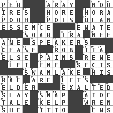 ACROSS 1. For each 4. Like ___ of sunshine 8. And not 11. Angers 13. Greater amount 14. Israeli folk dance 15. "Silly old bear" 16. Cooking vessels 17. ____ Bator 18. Center 21. Maternal 22. Fly high 23. Retirement account (abbr.) 25. Born 26. A saturated hydrocarbon 29. Orators 32. Desist 34. Director Reiner 35. Call ___ day 38. Otherwise 39. Aches 41. French philosopher Descartes 43. Allow 44. Compass dir. 45. Religious groups 46. Tchaikovsky ballet 50. Part of HMS, perhaps 51. Actress Charlotte 54. "We ___ not amused" (Victoria) 55. Allows 57. A person who is older than you are 59. Honored 63. Kill 64. Fastener 67. Helper 68. Lie 69. Seaweed 70. Songbird 71. A female animal or person 72. "Tell ____ the Marines!" 73. Followers of ems DOWN 1. Corncob 2. Greek god of love 3. Vintage cars 4. Electrical Unit 5. Friend of Pooh 6. Tate display 7. It is so 8. Pitcher Ryan 9. Declaim 10. The wife of a rajah (variant) 12. "______ My Girl" (Turtles hit) 14. Attila the _ 19. Olfactory organ 20. Head covering 21. Ewer handle 23. Image 24. Confederate soldiers (slang) 26. Adept person 27. 1994 drama film starring Jodie Foster 28. Comfort 30. Satellite of Uranus 31. Father 33. Arranges properly for use 36. Technician 37. Against 39. Lightbulb-shaped fruit 40. Queen of England 1702-14 42. Curvy letter 45. Stalk of a moss capsule 47. Armed conflict 48. City in Syria 49. Dry husk or covering 51. Musical pauses 52. Assad's deity 53. Peak District village in England 56. Cole _ (cabbage dish) 58. Sight organ 60. Become fatigued 61. Locale of original sin 62. Hiding places for outlaws 64. What Jean-Claude Killy likes to do 65. Fish or hair follower 66. The first octave above the treble staff