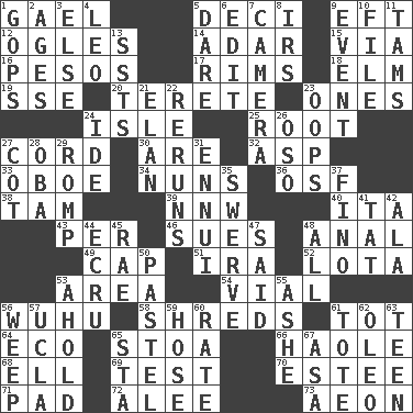 ACROSS 1. Highlander 5. Tenth: prefix 9. Bank Draft (abbr.) 12. Stares at amorously 14. The sixth month of the Jewish calendar 15. By way of 16. Mexican monetary units 17. Basketball hoops 18. Shade tree 19. Compass dir. 20. Cigar-shaped 23. Singles 24. Capri or Wight 25. Carrot, for example 27. Drawstring 30. "We ___ not amused" (Victoria) 32. Viper 33. Mitch Miller's instrument 34. Religious women 36. Order of Saint Francis (abbr.) 38. Scottish cap 39. Compass dir. 40. Call ___ day 43. For each 46. Takes to court 48. Of or related to the anus 49. Head covering 51. Lyricist Gershwin 52. Globular water bottle used in Asia 53. Length times width 54. Small bottle 56. Chinese city south-southwest of Nanjing 58. Tears up 61. Small child 64. Environmental prefix 65. Portico 66. White Person, in Hawaii 68. Pipe bend 69. Trial 70. First name in cosmetics 71. Writing tablet 72. Toward shelter 73. A really long time DOWN 1. Republicans 2. Grows older 3. Otherwise 4. Lion 5. Have the gumption 6. Prepare for publication 7. Device for capturing images 8. Big collection agency 9. Happening 10. Do some clerical work 11. Scottish caps 13. Fast planes 21. Liveliness 22. Summer TV shows 23. I made a mistake 24. Binary compound 26. Bear (Spanish) 27. Small bed 28. Chief or king in Benin or Nigeria 29. Frolic 31. World-weariness 35. Turn aside suddenly 37. Fine (Spanish) 41. Make lace 42. According to 44. Shade of tan 45. Actress Charlotte 47. Alleged 48. Everything 50. Soft color 53. Hold, grip (Informal) 55. American tennis player Robert 56. Shed a tear 57. Southern CA. univ. 59. Flexible conduit 60. Pace 61. Lug 62. Butter sub 63. Adolescent 65. R.R. building 67. White ___ sheet