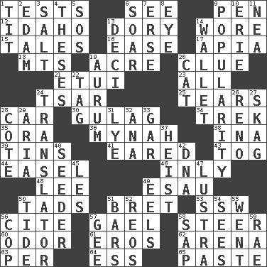 ACROSS 1. Trials 6. Perceive with the eye 9. Animal enclosure 12. Potato state 13. Small, narrow, flatbottom fishing boat 14. Had on 15. Falsehoods 16. Relaxation 17. Capital of Western Samoa 18. Mountains (abbr.) 19. Measure of real estate 20. A slight indication 21. Needle holder 23. 100% 24. Russian ruler of old 25. Lacerates 28. Automobile 30. POW camp 34. Long journey 35. Mouth or opening 36. Non-adult bird? 38. _ tizzy (2 wds.) 39. Airtight sealed metal containers 41. Having ears or earlike features 43. Coat; cloak 44. Artist's stand 46. Inwardly 48. Area sheltered from the wind 49. Son of Isaac 50. Bits 51. Cy Young winner Saberhagen 53. Compass dir. 56. Quote 57. Highlander 58. Bull 60. Aroma 61. Greek god of love 62. Sports stadium 63. For each 64. Double-curved letter 65. Thick mixture DOWN 1. Teat (slang) 2. Dutch treat 3. Table seasoning 4. College papers 5. Mayday 6. Fly high 7. Celtic language 8. Sight organ 9. Teen's desire 10. One of the Great Lakes 11. Teachers' org. 13. Tenth: prefix 14. Place for singles 19. Gold (Symbol: Au) 20. Feline 22. Label 24. Interpreter 26. Former U.S. Attorney General Janet 27. Heroin 28. ____ d'Azur (French Riviera) 29. Roberta Peters solo 31. Potassium hydroxide 32. Santa ___, CA 33. Slender fish 37. Robbery 40. Sowing specialist 42. Heredity factor (abbr.) 45. French article 47. A period of five years 49. Snakelike fish 50. Periodic rise and fall of the sea level 51. Oblong pieces of solid material 52. Vintage cars 54. Perceives with the eye 55. Gone 56. Police officer (slang) 57. Unit of force equal to gravity 58. Plant excrement 59. Actress Charlotte