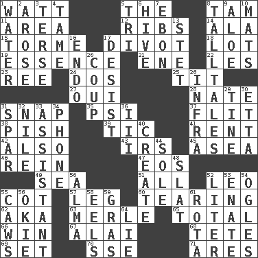 ACROSS 1. Electrical Unit 5. Definite Article 8. Scottish cap 11. Type of rug 12. Chest bones 14. According to 15. Singer Mel 17. A piece of turf (Scot.) 18. Car dealer's back yard 19. Substance 21. Compass dir. 22. French article 23. To riddle 24. Two (Sp.) 25. Teat (slang) 27. Fr. "Yes" 28. Nathan's nickname 31. Fastener 35. 23rd letter of the Greek alphabet 37. Secret move to avoid paying debts 38. Expression of disdain 39. Nervous spasm 41. Monthly bill 42. In addition 43. Big collection agency 45. Toward the sea 46. It's straight from the horse's mouth 47. Greek goddess of the dawn 49. Ocean 51. Everything 52. Lion 55. Small bed 57. Part of a journey 60. Separating forcefully 62. Alias (abbr.) 63. Haggard of country music 65. Add up to 66. Victory 67. Mountain range southwest of Kyrgyzstan 68. False hair 69. Put into a specified state 70. Compass dir. 71. Ancient Greek god of war DOWN 1. Wetness 2. Came up 3. Laconic 4. Docile 5. Three (prefix) 6. Hub of activity 7. Inky black, to poets 8. Baron Munchausen's specialties 9. _ vera 10. Floor coverings 13. Proofreading order 16. Inside; within (prefix) 17. Stop 20. Overturn; upset 26. Kind of red light 29. Prong on a fork 30. Singer James 31. Practice fight 32. "Death on the ____" 33. Aide 34. Give a jingle 36. One more than two 40. Make 44. Not divided or shared with others 48. Narrow board 50. _ mater 52. 61 cubic inches 53. Maternal 54. Stares 55. Crow sounds 56. Migrant worker of the '30s 58. Snakelike fish 59. Pate de foie ____ 61. Roll call or roster of names 64. Whopper