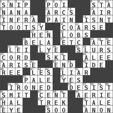 ACROSS 1. Sever or remove by pinching or nipping 5. Luau course 8. R.R. building 11. Nanny 12. Arches 14. Wind 15. Kind of red light 17. Ache 18. Is not 19. A girl or young woman (variant) 21. Rough 23. Layer 25. Tennis shots 26. Actor Lugosi 27. And so on (abbr.) 28. Had dinner 31. Luau accessory 33. Sodium hydroxide 35. Runs notes together 37. Drawstring 38. What Jean-Claude Killy likes to do 40. Toward shelter 41. Ascend 43. Conclude 45. Binary compound 46. To separate or throw off 47. French article 50. One who doesn't tell the truth 52. Diluted with white 53. It is so 54. Pressed 56. Cease 61. Stricken, poetically 62. Penny 65. Nest on high 66. Actor Linden 67. Long journey 68. Lie 69. Sight organ 70. "Barney Miller" actor Jack 71. Soon (poet.) DOWN 1. In a ____ (agitated or irritated) 2. Billionth: prefix 3. Information 4. Role in a play 5. Infant food 6. Mouth or opening 7. Tapering mass of hanging ice 8. Backtalk 9. Prong on a fork 10. Nonscientific branch of learning 13. Snout, nose 16. American tennis player Robert 18. Big collection agency 20. Shout 22. Lettered men learn these first 24. Negative votes 26. Auction offers 28. Old (Scot.) 29. Family _ (genealogy) 30. Compass dir. 31. Old wives' tales, e.g. 32. 4th largest of the Great Lakes 34. Make supply last 36. Den 37. Automobile 39. In an inward manner 42. Style 44. Passed on 48. Opt 49. Spring feasts 51. Toward the sea 52. Plant holder 54. "If ____ say so..." 55. Cause heat under the collar 57. Stalk of a moss capsule 58. SW Asia republic 59. Grain storage tower 60. Adolescent 61. A female animal or person 63. Modern: prefix 64. Ring climax