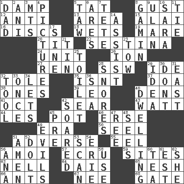 ACROSS 1. Moist 5. Make lace 8. Abrupt rush of wind 12. Opposed to 13. Length times width 15. Jai _ 16. Flat circles 18. Soaks 19. Female horse 20. Teat (slang) 22. French poetic form 24. A single undivided whole 26. Electrically charged atom 27. Western Nevada city 28. Compass dir. 29. Binary compound 32. Lacquered or enameled metalware 35. Is not 37. ___ good deed 38. Singles 39. Lion 40. Lairs 41. Sep. follower 42. Shrivel 43. Electrical Unit 44. French article 45. Plant holder 46. Celtic language 49. Period 50. Sew up the eyelids of hawks and falcons 51. Contrary to your interests or welfare 55. Snakelike fish 56. Mine, in Marseilles 57. Shade of tan 59. Settings 63. 1994 drama film starring Jodie Foster 64. Raised platform 65. Soft 66. Pismires 67. Born 68. Yard entry DOWN 1. Male parent 2. Cuckoo 3. Mountains (abbr.) 4. Photos 5. The 23rd letter of the Hebrew alphabet 6. Ancient Greek god of war 7. False hair 8. Homeless child 9. ____ Bator 10. "Two Mules for Sister ____" 11. Neckwear 14. Help 17. Trig term 21. Shallow baking pan 23. Pull behind 25. Bathroom plumbing fixture 28. Sounds asleep 29. It may be bright or harebrained 30. Do not 31. Compass direction 32. Utensil 33. Single time 34. Allows 36. Ocean 40. Home 42. Flew 45. Before (prefix) 47. To sift 48. Observes 49. Vices 51. So be it 52. Stupid person 53. Glance over 54. 4th largest of the Great Lakes 56. Santa ___, CA 58. Purpose 60. Afternoon social gathering 61. Eastern Standard Time (abbr.) 62. A female animal or person