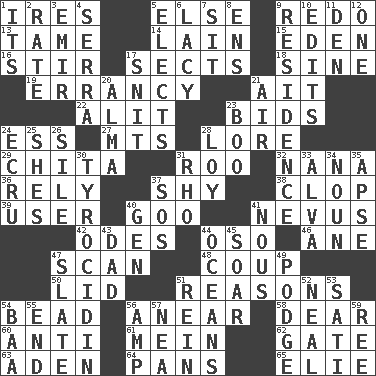 ACROSS 1. Angers 5. Otherwise 9. Make new 13. Not wild 14. (Had) reclined 15. Locale of original sin 16. Move through with a circular motion 17. Religious groups 18. Trig term 19. The state or an instance of erring 21. Small island 22. Came down and settled, as after flight 23. Auction offers 24. Curvy letter 27. Mountains (abbr.) 28. Old wives' tales, e.g. 29. Riviera of "Kiss of the Spider Woman" 31. Friend of Pooh 32. Grandmother 36. Have trust in 37. Like a shrinking violet 38. Hoof sound 39. One who makes use of a thing 40. Thick or sticky substance 41. Congenital growth or mark on the skin 42. Lyric poems 44. Bear (Spanish) 46. One (Scot) 47. Examine hastily 48. Clever action or accomplishment 50. Hat (slang) 51. Thinks logically 54. Necklace unit 56. Approach 58. Letter starter 60. Opposed to 61. Chow _ 62. Yard entry 63. An important port of Yemen 64. Zero-star reviews 65. Writer Wiesel DOWN 1. It is 2. Assign a rank or rating to 3. Independent ruler or chieftain 4. Father Junipero _ 5. Chooses 6. Made of lace 7. Be seated 8. Followers of ems 9. Dwelling 10. Prepares for publication 11. Lair 12. Single 17. In a ____ (agitated or irritated) 20. _ mater 21. Atmosphere 23. Oct. 31 cry 24. Shade of tan 25. "______ My Girl" (Turtles hit) 26. Drop; flow; fall 28. Myrna of the movies 30. Polypeptide antibiotic 31. 17th letter of the Greek alphabet 33. Inventor's middle name 34. Part of speech 35. Domed church section 37. Mayday 40. Commissioned military rank (abbr.) 41. Common sense 43. June honoree 44. Seas 45. Fly high 47. Chalkboard 49. Plash 51. It's straight from the horse's mouth 52. Actress Patricia 53. Suttee (variant) 54. Sound made by sheep 55. Conclusion 56. Electrical Unit 57. Teachers' org. 59. To riddle