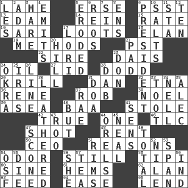 ACROSS 1. Unable to walk 5. Celtic language 9. Inconspicuous attention getter 13. Dutch treat 14. It's straight from the horse's mouth 15. Pace 16. Indian skirt 17. Plunders 18. Liveliness 19. Modes 21. Pacific Standard Time (abbr.) 22. The founder of a family 23. Raised platform 24. Lubricate 27. Flaplike covering 28. Texas town _ City 29. Shrimp-like planktonic crustaceans 31. One of the 12 tribes of Israel 32. Inactive volcano in Sicily 36. French philosopher Descartes 37. Director Reiner 38. Christmas carol 39. At sea 40. Sound made by sheep 41. Fur scarf 42. Loyal 44. Single 46. Affectionate concern, for short 47. Went for two points 48. Monthly bill 50. Corporate head (abbr.) 51. Thinks logically 54. Scent 56. Not moving 58. Native american tent (variation) 60. Trig term 61. Is hesitant and indecisive 62. ____ Jay Lerner 63. Nourish 64. Relaxation 65. Grant temporary use of DOWN 1. French article 2. First man 3. Female horse 4. Gives off 5. Worn away 6. Vintage cars 7. Be seated 8. Followers of ems 9. Elected leader of a country 10. Table seasonings 11. R.R. building 12. Nine, plus one 17. Australian parrot (variant) 20. Land elevation 21. Writing tablet 23. Spanish title 24. Gumbo ingredient 25. Angers 26. Actor's bit 28. Pat or tap gently 30. Tough but pliablecoriaceous 31. ___ good deed 33. A blast of a horn 34. 1994 drama film starring Jodie Foster 35. Actor Baldwin 37. Actress Charlotte 40. With the exception that 41. Elected reps. 43. Friend of Pooh 44. Threatening words 45. Anneal 47. Biscuitlike quick bread 49. "_____ Recall" 51. Basketball hoops 52. Mediterranean tributary 53. Connect, as a bridge 54. Order of Saint Francis (abbr.) 55. Pass on 56. A female animal or person 57. Beverage made from leaves 59. Indiana (abbr.)