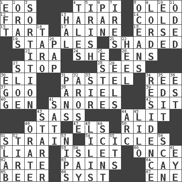 ACROSS 1. Greek goddess of the dawn 4. Native american tent (variation) 8. Margarine 12. From 13. Ethiopian city, capital of Harari 14. Lacking warmth 15. Small pie 17. Place in a line 18. Celtic language 19. Paper fasteners 21. Cast a shadow over 23. Lyricist Gershwin 24. A female animal or person 26. Followers of ems 27. Halt 28. Perceives with the eye 30. Connecticut Ivy Leaguer 31. Soft color 34. To separate or throw off 37. Thick or sticky substance 38. Satellite of Uranus 39. Begley and Asner 40. Commissioned mil. rank 41. Sounds asleep 42. Be seated 43. Backtalk 44. Set down 46. Baseball player Mel 47. Raised railways 50. To free from 51. Put through a sieve 54. Winter's stalactites 57. One who doesn't tell the truth 58. Small island 60. Single time 62. Johnson of "Laugh-In" 63. Aches 64. Island 65. Fermented drink made from hops 66. System (abbr.) 67. Compass dir. DOWN 1. Bank Draft (abbr.) 2. Mouths or openings 3. Conclusion 4. Lies 5. From or relating to Ireland 6. Baking dish 7. Angers 8. Seas 9. Titled peers of a realm 10. Otherwise 11. Wrote a lyric poem 13. Actor Linden 16. Pacific island yam 20. Infant food 22. The bottom of a shoe or boot 25. First name in cosmetics 27. A type of plum 29. Snakelike fish 30. Oval reproductive body of a fowl 31. Zero-star reviews 32. Came up 33. Title for a knight 34. Dwelling 35. Prepare for publication 36. Eastern Standard Time (abbr.) 41. Suttee (variant) 43. A viewer who gazes fixedly 44. Curve 45. _ and Stitch 46. Declaim 48. Ms. Damita and namesakes 49. Odor 51. Broad, flat, thick piece 52. Hoop that covers a wheel 53. Cuts off 55. It is 56. Examine minutely or intensely 59. Declare 61. Sight organ