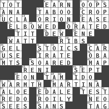 ACROSS 1. Small child 4. Merit 8. I made a mistake 12. Santa ___, CA 13. Off limits 14. Riding implement 15. Southern CA. univ. 17. Greek mythologigal hunter 18. Relaxation 19. Turned at an angle; bent 21. Spoke pompously 23. Teat (slang) 24. Morning condensation 26. Compass dir. 27. Electrical Unit 28. Chest bones 30. Set 31. Unemotional ones 34. 4-wheeled motor vehicle 37. Purpose 38. Feeling or showing extreme anger 39. Chief or king in Benin or Nigeria 40. Mountains (abbr.) 41. Flew 42. Atlas unit 43. Painter Guido (1575-1642) 44. Back-to-school mo. 46. A really long time 47. Scottish cap 50. Wedding promise 51. Heat 54. Chrissie's court nemesis 57. _ vera 58. Peak District village in England 60. Trial 62. Redecorate 63. Turbulent 64. Modern: prefix 65. Perceives with the eye 66. Without 67. Label DOWN 1. The 19th letter of the Greek alphabet 2. Single time 3. Baron Munchausen's specialties 4. Having ears or earlike features 5. Stay 6. Friend of Pooh 7. Words to Nanette 8. Seas 9. Declaim 10. Airs 11. Moved rapidly 13. Pull behind 16. "This won't hurt ____!" 20. Baseball player Mel 22. Confederate soldiers (slang) 25. Compose 27. 270 degrees 29. On the rocks 30. Chewing product 31. The Jewish people; Israel 32. Distinguishing feature 33. Rowing implement 34. Piece 35. Blind as ____ 36. Hit sharply and swiftly 41. Posted 43. Lover boys 44. Be seated 45. Prepare for publication 46. Wear away 48. At full speed 49. Promenades 51. Armed conflicts 52. Toward shelter 53. Possessive pronoun 55. Marina Del _, California 56. At sea 59. ___ good deed 61. Coat; cloak