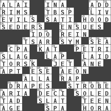 ACROSS 1. Mountain range southwest of Kyrgyzstan 5. _ tizzy (2 wds.) 8. Increase 11. Basketball hoops 12. Cook's measure (abbr.) 14. 54 in ancient Rome 15. Vices 17. Suttee (variant) 18. Parka part 19. Spring feasts 21. Takes place subsequently 23. Wedding promise 25. It's straight from the horse's mouth 26. Russian ruler of old 27. Symbol (abbr.) 28. Ocean 31. Accounting whiz (abbr.) 33. Krazy ___ of comics 35. _ dish (used to culture cells) 37. Volcanic refuse 38. Infant locale 40. Put down 41. Cod relative 43. Passenger plane 45. One (Scot) 46. Fitting 47. Compass dir. 50. Period of immesurable duration 52. Silent film actress Nazimova 53. Hit sharply and swiftly 54. Window treatments 56. Disco prop 61. Roberta Peters solo 62. Tenth: prefix 65. Having a sole or soles 66. Small boy 67. Narrow board 68. Adolescent 69. Ripen 70. Health resort 71. Israeli folk dance DOWN 1. Ancient Greek god of war 2. Moving, as bait 3. Among 4. Capri or Wight 5. ___ a Wonderful Life 6. Basketball assoc. 7. Michaelmas daisies 8. Medicinal plant 9. "Vaya con ____" 10. Movie disc 13. Abounding in pines 16. Indian titles of respect 18. Attila the _ 20. Neighbor of Neb. 22. Simple or foolish person 24. Spoken 26. Labels 28. Comedian Laurel of Laurel & Hardy 29. One of the Great Lakes 30. Assist 31. Hoof sound 32. Component 34. _ Mahal 36. Style 37. R.R. building 39. Lightbulb-shaped fruit 42. Seaweed 44. Beverages made from leaves 48. Bobsleighs 49. Artist's stands 51. Elects 52. Auto club (abbr.) 54. To draw with force 55. Travel on an animal 57. Writer of Portnoy's Complaint (1969) 58. Margarine 59. Fermented drink made from hops 60. Pulitzer Prize-winning author Ferber 61. _ moment's notice (2 wds.) 63. Head covering 64. Call ___ day