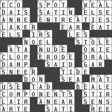 ACROSS 1. Environmental prefix 4. Blemish 8. Welt 12. Raised platform 14. Smooth fabric 16. Otherwise 17. Singer Murray 18. Pleas 20. Member of a famous L.A. basketball team 22. Ewer handle 23. Consume 24. Raised railways 25. Big collection agency 28. French article 30. Christmas carol 31. Took without asking 35. "One Day ___ Time" 37. Naked 40. Migrant worker of the '30s 41. Hoof sound 42. Eat (away) 44. Relating to the mouth 45. Moist 46. Expressed in words 47. Slender fish 48. Scornful expression 50. Event that recurs at intervals 52. Spanish title 54. Ocean 55. Floor protector 58. Purpose 61. Small boy 63. Memphis, Tenn. Street 65. Parts 70. Tumult 71. Den 72. Approach 73. Elected reps. 74. Johnson of "Laugh-In" 75. Suttee (variant) 76. Portuguese money of account (variant) DOWN 1. Peak District village in England 2. Lessep's creation 3. Pig sounds 4. Compass dir. 5. Baking dish 6. Baseball player Mel 7. Become fatigued 8. Soggy 9. Writer Wiesel 10. At sea 11. For fear that 13. Observe 15. Actress Patricia 19. Ancient Greek god of war 21. River (Sp.) 26. French philosopher Descartes 27. Disparaging remarks 29. Moe Howard, for one 30. Slept 32. Gumbo ingredient 33. One who doesn't tell the truth 34. Snakelike fish 35. Actor Alda or Thicke 36. Heavy book 38. ___ good deed 39. Proofreads 41. Music discs 43. Singer Brickell 49. Printing process, for short 51. Pat or tap gently 53. Nanny 55. Mother 56. Place in a line 57. Laconic 58. Southern CA. univ. 59. Fly high 60. Give off 62. Habitations of wild animals 64. Double-curved letter 66. Before (prefix) 67. Teachers' org. 68. Make lace 69. _ Lanka