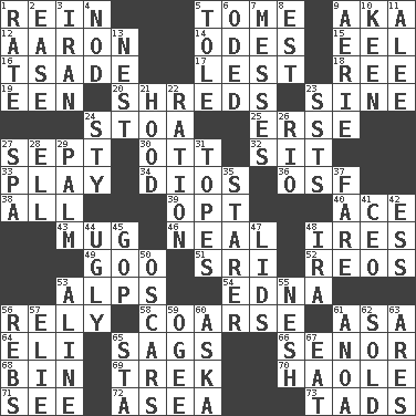 ACROSS 1. It's straight from the horse's mouth 5. Heavy book 9. Alias (abbr.) 12. Composer Copland 14. Lyric poems 15. Snakelike fish 16. Sadhe (variant) 17. For fear that 18. Portuguese money of account (variant) 19. Car or cant ending 20. Fragments 23. Trig term 24. Portico 25. Celtic language 27. Back-to-school mo. 30. Baseball player Mel 32. Be seated 33. Romp 34. "Vaya con ____" 36. Order of Saint Francis (abbr.) 38. 100% 39. Elect 40. Adept person 43. Large cup 46. Anneal 48. Angers 49. Thick or sticky substance 51. Indian title of respect (Mr.) 52. Vintage cars 53. High mountains 54. Pulitzer Prize-winning author Ferber 56. Have trust in 58. Rough 61. White ___ sheet 64. Biblical high priest 65. Settles 66. Sir (Sp.) 68. Storage container 69. Long journey 70. White Person, in Hawaii 71. Observe 72. Toward the sea 73. Small boys DOWN 1. Pace 2. Relaxation 3. SW Asia republic 4. Allow head to fall sleepily 5. Lacquered or enameled metalware 6. Wrote a lyric poem 7. Makes clutter 8. Eastern Standard Time (abbr.) 9. Nest on high 10. Peachy ____! 11. Toward shelter 13. Egg locale 21. Parka part 22. Food allowance for one day 23. Fast planes 24. Filthy place 26. _ de Janeiro 27. Health resort 28. Pipe bend 29. Inside of hand 31. Drinks excessively 35. A viewer who gazes fixedly 37. Conductor's collection 41. Corporate head (abbr.) 42. Double-curved letter 44. Unsightly 45. Grand Old Party 47. Flaplike coverings 48. Retirement account (abbr.) 50. Motion picture awards 53. Place in a line 55. Soft 56. Confederate soldiers (slang) 57. Writer Wiesel 59. Double curve, resembling the letter S 60. "____ silly question..." 61. Small Philippine buffalo 62. Exchanged or delivered for money 63. Ancient Greek god of war 65. R.R. building 67. Erode