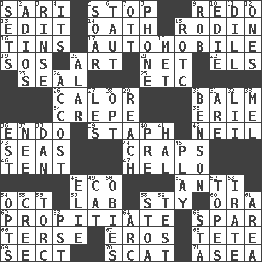 ACROSS 1. Indian skirt 5. Close up, plug up 9. Make new 13. Prepare for publication 14. Pledge 15. "The Thinker" sculptor 16. Metal containers 17. Form of transportation 19. Mayday 20. Tate display 21. Fish or hair follower 22. Raised railways 23. Lick closed 25. And so on (abbr.) 26. Bodily heat indicating an inflammation 30. Lip ointment 34. Streamer paper 35. One of the Great Lakes 36. Inside; within (prefix) 39. Staphylococcus 42. Famous astronaut Armstrong 43. Oceans 44. Dice game 46. Portable shelter 47. Phone greeting 48. Environmental prefix 51. Against 54. Sep. follower 57. Experiment locale 58. Filthy place 60. Mouth or opening 62. Conciliate 65. Coast Guard woman 66. Laconic 67. Greek god of love 68. Wig 69. Religious group 70. Get outta here! 71. Toward the sea DOWN 1. Puts into a specified state 2. Goodbye (Sp.) 3. Remove soap 4. It is 5. Fly high 6. Pulled tight 7. Baseball player Mel 8. Give a jingle 9. Director Reiner 10. Singer Brickell 11. Deli pickle 12. Singles 15. College mil. group 18. Was introduced to 20. Having or resembling wings 24. Buttonhole 27. French article 28. Elect 29. Arrive at 30. Gillaume's butler role 31. "We ___ not amused" (Victoria) 32. Cards in a Roman deck? 33. Cartoonist voice _ Blanc 36. Eastern Standard Time (abbr.) 37. Born 38. Daniel's nick name 40. Before (prefix) 41. Actor Linden 45. Romp 48. Writer Wiesel 49. Domesticated feline 50. Off-Broadway awards 52. Drinks excessively 53. Feeling or showing extreme anger 54. Elects 55. Algonquian 56. Torque (variant) 58. Portico 59. Trial 61. Type of rug 63. Pacific Standard Time (abbr.) 64. Curve 65. R.R. building