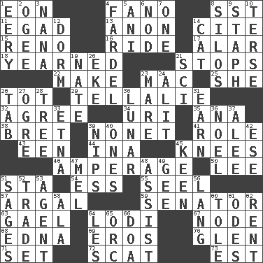 ACROSS 1. Period of immesurable duration 4. Papal veil 8. Fast jet (abbr.) 11. Mild oath 13. At once, immediately (arch.) 14. Quote 15. Former U.S. Attorney General Janet 16. Travel on or in a vehicle 17. Having or resembling wings 18. Felt deep pity or tenderness 21. Closes up, plugs up 22. Create 23. Apple computer (short form) 25. A female animal or person 26. Small child 29. Copy Pinocchio 32. Match 34. RI univ. 35. Santa ___, CA 38. Cy Young winner Saberhagen 39. Music written for nine 41. Hero or heavy, e.g. 43. Car or cant ending 44. _ tizzy (2 wds.) 45. Leg joints 46. Electrical Measurement 50. Area sheltered from the wind 51. R.R. building 54. Double-curved letter 55. Sew up the eyelids of hawks and falcons 57. Therefore, facetiously 59. Elected representative 63. Highlander 64. Farming town in central California 67. Thickened enlargement 68. Pulitzer Prize-winning author Ferber 69. Greek god of love 70. Small, secluded valley 71. Put into a specified state 72. Jazz singing style 73. Eastern Standard Time (abbr.) DOWN 1. Suggestive of the supernatural 2. Double curve, resembling the letter S 3. Nanny 4. Pack 5. Cuckoo 6. Lower and raise head in agreement 7. Single 8. Grain storage towers 9. Staphylococcus 10. Laconic 12. Dormintory (informal) 14. Feline 19. Nathan's nickname 20. Make supply last 21. _-fi 23. Female horse 24. Came down and settled, as after flight 26. Keyboard key 27. Legendary monster 28. Woody plant 30. Type of eclipse 31. Merit 33. Inactive volcano in Sicily 36. Christmas carol 37. Toward shelter 39. Cuts off 40. Washington bills 42. Compass dir. 45. Peachy ____! 47. Cartoonist voice _ Blanc 48. Help 49. Turn to the right 51. Gurus 52. Buy and sell 53. Representative 56. Austrian-born American filmmaker Fritz 58. In the manner of 60. Lacquered or enameled metalware 61. Lyric poems 62. Monthly bill 64. French article 65. The grampus (Milton) 66. ___ good deed