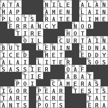 ACROSS 1. "One Day ___ Time" 4. The longest river in the world 8. Actor Alda or Thicke 12. Atlas unit 13. So be it 14. (Had) reclined 15. Graphs 18. Pace 19. Citrus frut 20. Tendancy to err 22. Lower and raise head in agreement 23. Become fatigued 24. Being at a high temperature 25. Petroleum 26. Window treatment 30. With the exception that 33. Soviet premier 1918-24 36. Pulitzer Prize-winning author Ferber 37. On the rocks 39. Was introduced to 40. Whirlpool 41. Jai ____ 42. 61 cubic inches 44. Mayday 45. More disrespectful 47. Clumsy lout 50. Neckwear 51. Blind as ____ 53. Luau course 54. Devices for capturing images 57. Composer Stravinsky 59. Lightbulb-shaped fruit 61. Trials 63. Small pie 64. Land measure 65. Make lace 66. Pismires 67. Plant holders 68. Period DOWN 1. Electrical Unit 2. Story 3. To the left, to Queeg 4. Drug cop 5. "If ____ say so..." 6. Allow 7. Compass dir. 8. One to whom something is allotted 9. Put down 10. Direct toward a target or goal 11. Compass dir. 16. Musical group of three 17. Indian skirt 21. 1994 drama film starring Jodie Foster 22. And not 24. Attila the _ 26. Quote 27. Sums up 28. _ china 29. Negative votes 30. Prejudice 31. Southern CA. univ. 32. Afternoon social gatherings 34. Arab leader 35. Remaining after all deductions 38. What propaganda does 42. Area sheltered from the wind 43. Wander 46. One more than two 48. Collude with 49. Conductor's collection 52. Clothes sense 53. Left side of a ship or aircraft 54. Heavy open wagon 55. Ancient Greek god of war 56. Play the lead 57. Call ___ day 58. Separate the seeds from cotton 59. Infant food 60. Environmental prefix 62. R.R. building