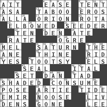 ACROSS 1. Small island 4. Comfort 8. Portable shelter 12. White ___ sheet 13. Off limits 14. Greek god of love 15. Silent film actress Nazimova 17. Constellation of myth 18. Roll call or roster of names 19. Shoved, as through a crowd 21. Sowing specialist 23. "___ Little Indians" 24. Lair 26. Had dinner 27. Pace 28. Legendary monster 30. Cartoonist voice _ Blanc 31. Titan orbits this 34. Definite Article 37. A saturated hydrocarbon 38. One or ones belonging to thee 39. To free from 40. Affirmative reply 41. A girl or young woman (variant) 42. Raised railways 43. Lick closed 44. Slanted text style (abbr.) 46. Put into a specified state 47. One of the 12 tribes of Israel 50. Small boy 51. Cast a shadow over 54. Eat 57. Airs 58. Nick name for Arthur 60. Periodic rise and fall of the sea level 62. Independent ruler or chieftain 63. Trap for birds or small mammals 64. 54 in ancient Rome 65. Cub Scout units 66. Went 67. Area sheltered from the wind DOWN 1. Auto club (abbr.) 2. Capri or Wight 3. Baron Munchausen's specialties 4. Having ears or earlike features 5. Tolerate 6. "Barney Miller" actor Jack 7. Immeasurably long periods of time 8. Cylindrical with tapered ends 9. Wear away 10. Brief written record 11. Russian ruler of old 13. Pull behind 16. Collude with 20. Single 22. Merit 25. Parts of speech 27. French philosopher Descartes 29. Jennifer or Joel 30. Can I? 31. Portico 32. Hold, grip (Informal) 33. Teat (slang) 34. Excercise machine 35. Land elevation 36. Begley and Asner 41. False hair 43. Spring feasts 44. ___ a Wonderful Life 45. Pulled tight 46. Indian antelope 48. 13-14th century defensive garment 49. Annoying sound 51. Hurried 52. Dwelling 53. Mild oath, euphamism for damn 55. Born 56. Singer Brickell 59. Friend of Pooh 61. First lady