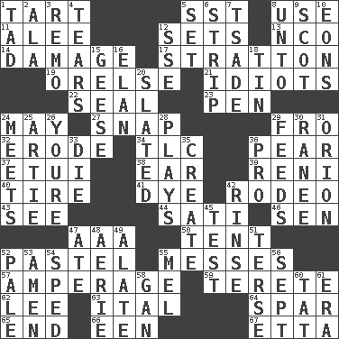 ACROSS 1. Small pie 5. Fast jet (abbr.) 8. Purpose 11. Toward shelter 12. Puts into a specified state 13. Non-commissioned officer (abbr.) 14. Break 17. Ski resort town in Vermont 19. Threatening words 21. Foolish or stupid persons 22. Lick closed 23. Animal enclosure 24. Fifth month 27. Fastener 29. Away 32. Eat (away) 34. Affectionate concern, for short 36. Lightbulb-shaped fruit 37. Needle case 38. Ewer handle 39. Painter Guido (1575-1642) 40. Become fatigued 41. Color 42. Cowboy competition 43. Perceive with the eye 44. Suttee (variant) 46. Elected rep. 47. Auto club (abbr.) 50. Portable shelter 52. Soft color 55. Makes clutter 57. Electrical Measurement 59. Cigar-shaped 62. Area sheltered from the wind 63. Slanted text style (abbr.) 64. Practice fight 65. Conclude 66. Car or cant ending 67. Singer James DOWN 1. Small amount or degree 2. Insect wing 3. San ____ (Riviera town) 4. Pulls into pieces 5. Arrange properly for use 6. Empty completely 7. Sadhe (variant) 8. To (old English) 9. Highlander 10. Immeasurably long periods of time 12. Compass dir. 15. Honkers 16. Liveliness 18. Metal container 20. Scheduled 24. Confronts 25. Nick name for Arthur 26. You are 28. Romps 29. Gives food to 30. Indian princess (variant) 31. Greek mythologigal hunter 33. Pass on 35. Cause to be 36. Adept person 42. Remove soap 45. Trial 47. Had dinner 48. Nest on high 49. Having winglike extensions 51. Laconic 52. Light colored 53. So be it 54. Hurried 55. Cartoonist voice _ Blanc 56. Back-to-school mo. 58. Separate the seeds from cotton 60. Make lace 61. Period