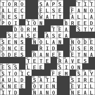 ACROSS 1. "Corrida" creature 5. Plant excrements 9. Teat (slang) 12. Actor Baldwin 13. Otherwise 14. Papal veil 15. Repose 16. Electrical Unit 17. Silent film actress Nazimova 18. Luau course 19. Electrically charged atom 21. A special lineage 22. Dormintory (informal) 24. Afternoon social gathering 26. Filthy place 27. Gospel singer Marvin 28. Toward the sea 29. Elected reps. 30. Pitcher Ryan 32. Connecting point 36. At one time in the past 37. To free from 38. One who uses or employs something 39. Lyric poems 40. The wife of a rajah (variant) 42. Inactive volcano in Sicily 43. False hair 44. All-night dance parties 46. Curvy letter 49. Area sheltered from the wind 50. The Jewish people; Israel 51. Unemotional 53. Opposite of masc. 54. Declare 57. Old (Scot.) 58. Suttee (variant) 61. The founder of a family 62. Leg joint 63. Baking chamber 64. Morally bad or wrong 65. It would 66. Billionth: prefix 67. Be tempered by heat DOWN 1. Canvas cover 2. Butter sub 3. Dwelling 4. Sep. follower 5. Stitched 6. Chicken ___ king 7. Pacific Standard Time (abbr.) 8. Put into a specified state 9. Stories 10. An arm off of a larger body of water 11. Sycophant 14. At a great distance 19. Big collection agency 20. Sign of things to come 21. Sound made by sheep 23. Fertile tracts in a desert 24. Sadhe (variant) 25. Car or cant ending 27. Transmit 28. Place in a line 29. "Barney Miller" actor Jack 31. Declaim 32. New (sp.) 33. Clearly or manifestly demonstrative 34. Habitations of wild animals 35. Epoch 40. To riddle 41. Celtic language 43. Affectionate concern, for short 45. Direct toward a target or goal 46. 1973 Nobel Price Winner (Physics) Leo 47. Difficult or unusual or dangerous feat 48. Having a sole or soles 52. Binary compound 53. Fine (Spanish) 55. Operatic vocal solo 56. Shout 58. Male offspring 59. Actress Gardner 60. Nine, plus one 61. Elected rep.