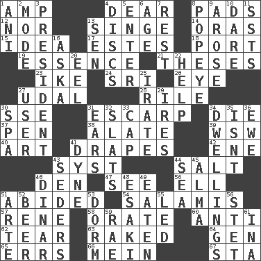 ACROSS 1. Electrical Unit 4. Letter starter 8. Groovy apts. 12. Not either 13. Scorch 14. Mouths or openings 15. The main thing one is thinking about 17. _____ Park, CO 18. Left side of a ship or aircraft 19. Core 21. College papers 23. Mamie's husband 24. _ Lanka 26. Sight organ 27. Hereditary estate 28. Cause heat under the collar 30. Compass dir. 31. Fortification 34. Pass on 37. Fenced enclosure 38. Having winglike extensions 39. Compass dir. 40. Tate display 41. Window treatments 42. Compass dir. 43. System (abbr.) 44. Table seasoning 46. Lair 47. Perceive with the eye 50. Pipe bend 51. Remained 54. Deli grouping 57. French philosopher Descartes 58. Speak pompously 60. Against 62. Rend 63. Swept the length of 64. Commissioned mil. rank 65. Blunders 66. Count _ (2 wds.) 67. R.R. building DOWN 1. Cuckoo 2. Method 3. Elected leader of a country 4. Plates 5. Keyboard key 6. Mature 7. Relief 8. Wimpy's pal 9. Came up 10. Have the gumption 11. Fast planes 13. Elected rep. 16. "____ silly question..." 20. Snakelike fish 22. Assist 25. Feeling or showing extreme anger 27. One who uses or employs something 29. Angers 30. Health resort 31. Hearing organs 32. Narrow boards 33. Head covering 34. Homes 35. Is not 36. She-sheep 41. Unit of force 43. Spring feasts 44. Ocean 45. _ mater 46. Middle Eastern gold or silver currency 48. 1973 Nobel Price Winner (Physics) Leo 49. Consumed 51. Johnson of "Laugh-In" 52. Fermented drink made from hops 53. Dormintory (informal) 55. Directed 56. Proofreading order 59. Actress Charlotte 61. _ tizzy (2 wds.)