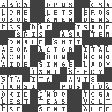 ACROSS 1. Lettered men learn these first 5. Musical composition 9. Girls' org. (abbr.) 12. Old wives' tales, e.g. 13. Allows 14. Greek god of love 15. Mitch Miller's instrument 16. Afresh 17. Habitations of wild animals 18. Curvy letter 19. Clumsy lout 21. Sadhe (variant) 22. Indian titles of respect 24. White ___ sheet 26. Nine, plus one 27. A sleeping potion; an opiate (poet.) 28. Stricken, poetically 29. A really long time 30. Thespian 32. Slanted text style (abbr.) 36. Land measure 37. Attila the _ 38. Words to Nanette 39. Assistant 40. Burn superficially 42. Kenny Rogers chart-topper in '80 43. Is not 44. Sleazy 46. R.R. building 49. Call ___ day 50. Pismires 51. Tarsus (plural) 53. Product of festering 54. Coat; cloak 57. Migrant worker of the '30s 58. Southeast Asian peninsula 61. Ancient Roman robe 62. For fear that 63. Afternoon social gatherings 64. Electrical Unit 65. Compass dir. 66. Emitted 67. Toward shelter DOWN 1. Medicinal plant 2. Moves up and down 3. What you're doing now 4. Perceive with the eye 5. Norwegian king 6. Writing instrument 7. Shoshoni 8. Compass dir. 9. Relatively large 10. Message 11. NE Netherlands city 14. Begley and Asner 19. Lubricate 20. At sea 21. Make lace 23. Indian princess (variant) 24. Amid 25. Title for a knight 27. Tenth: prefix 28. Check the growth or development of 29. Auto club (abbr.) 31. Large country 32. An arm off of a larger body of water 33. Inedible or poisonous agaric 34. "60 Minutes" Commentator Rooney 35. Myrna of the movies 40. Fast jet (abbr.) 41. He sold his birthright 43. One more than two 45. Followers of ems 46. Took without asking 47. Receives possession of 48. Ascend 52. Arrange properly for use 53. Mail 55. Stare 56. Yard entry 58. ___ a Wonderful Life 59. Born 60. Daniel's nick name 61. Federal power corp.