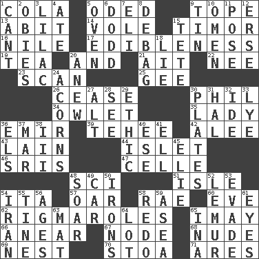 ACROSS 1. Root beer relative 5. Wrote a lyric poem 9. Drink excessively 13. "This won't hurt ____!" 14. Grand slam 15. Southeast Indonesia island 16. The longest river in the world 17. The property of being fit to eat 19. Beverage made from leaves 20. Added to 21. Small island 22. Born 23. Skim 25. Turn to the right 26. Desist 30. Silvers or Donahue 34. A small or young owl 35. Kenny Rogers chart-topper in '80 36. Independent ruler or chieftain 39. Giggle 42. Toward shelter 43. (Had) reclined 44. Small island 46. Indian titles of respect 47. Cell (Danish) 48. _-fi 51. Capri or Wight 54. Call ___ day 57. Rowing implement 58. Actress Charlotte 60. Night before a holiday 62. Frustrating wastes of time 65. "If ____ say so..." 66. Approach 67. Thickened enlargement 68. Naked 69. Egg locale 70. Portico 71. Ancient Greek god of war DOWN 1. Patter 2. Off-Broadway awards 3. Pale purple color 4. Had dinner 5. Baking chamber 6. Texas town _ City 7. Biblical high priest 8. Debunk (Brit. slang) 9. Metal container 10. Sign of something about to happen 11. Airs 12. Celtic language 15. False hair 18. Falsehood 20. Afresh 24. Oak nuts 27. Keyboard modifier key 28. Perceive with the eye 29. Principle of right and wrong 30. Food holders 31. Actor Linden 32. Binary compound 33. Potassium hydroxide 36. Raised railways 37. Make imperfect 38. One more than two 40. Compass dir. 41. Pipe bend 45. Writer Wiesel 48. Fly high 49. Auto 50. Metal shackles 52. Arboreal primate 53. Dodge 54. SW Asia republic 55. Prong on a fork 56. Eons 58. Do over again 59. Toward the sea 61. Snake ____ (dice throw) 63. Floor protector 64. Car dealer's back yard 65. _ tizzy (2 wds.)