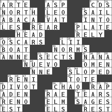 ACROSS 1. Johnson of "Laugh-In" 5. Viper 8. Music discs 11. 0 degrees 13. Lion 14. Move on water 15. Phillipine bananalike plant 16. Large container 17. To the inside or interior of 18. French article 19. Located in or toward the back 21. Food holder 22. Froth on beer 24. Have confidence or faith in 25. Motion picture awards 27. Cards in a Roman deck? 29. Water vessel 30. Typical standards 32. Singer Murray 33. Religious groups 35. Grandmother 39. New (sp.) 41. Sign of something about to happen 42. Compass dir. 43. Had an oblique or slanted direction 45. Painter Guido (1575-1642) 48. Carry 49. A piece of turf (Scot.) 50. US Secretary of Labor Elaine L. _ 52. Hit sharply and swiftly 55. Arabian gulf 56. Actress Charlotte 57. Pulls into pieces 59. Western Nevada city 60. Shade tree 61. Gurus 62. Eastern Standard Time (abbr.) 63. Raised railways 64. Relief DOWN 1. Of or related to the anus 2. Loose flowing garment 3. File 13 4. And so on (abbr.) 5. Inventor's middle name 6. Shrivel 7. Cooking vessel 8. Lessep's creation 9. Simple song 10. A type of plum 12. Ethiopian city, capital of Harari 14. Filth; sediment 20. Begley and Asner 21. Demure 23. Eroded 25. Chief or king in Benin or Nigeria 26. Manchild 27. Car dealer's back yard 28. Big collection agency 30. Non-commissioned officer (abbr.) 31. Snob 33. Elected rep. 34. Night before a holiday 36. Electrical Measurement 37. Born 38. Plus 40. A single undivided whole 43. R.R. building 44. Plunders 45. Amusement-park features 46. Happening 47. Words to Nanette 49. Have the gumption 50. Give a ring to 51. Folds over and sews together 53. Ancient Greek god of war 54. Inconspicuous attention getter 56. To sift 58. Hearing organ