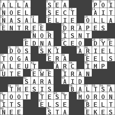 ACROSS 1. Silent film actress Nazimova 5. Ocean 8. Luau course 11. Christmas carol 12. Religious group 14. Small island 15. Rhinal 17. Writer Wiesel 18. Water jar 19. Main course 21. Window treatments 23. Not either 25. Is not 26. Pulitzer Prize-winning author Ferber 27. Corporate head (abbr.) 28. Color 31. Two (Sp.) 33. What Jean-Claude Killy likes to do 35. Satellite of Uranus 37. Ancient Roman robe 38. Period 40. Snakelike fish 41. Eskimo relative 43. Curve 45. Mischievous child 46. Shoshoni 47. She-sheep 50. SW Asia republic 52. "Two Mules for Sister ____" 53. Assist 54. College paper 56. Greek mezzo-soprano Agnes 61. A blast of a horn 62. Trial 65. Person of subnormal intelligence 66. ___ a Wonderful Life 67. Otherwise 68. Waist strap 69. Born 70. R.R. building 71. Makes supply last DOWN 1. Queen of England 1702-14 2. Grant temporary use of 3. For fear that 4. Having or resembling wings 5. Compass dir. 6. Snakelike fish 7. Being or containing an acid 8. Light colored 9. Petroleums 10. Call ___ day 13. Laconic 16. Grant temporary use of 18. Choose 20. Immeasurably long periods of time 22. Small Philippine buffalo 24. Immoral or dissolute person 26. He sold his birthright 28. South Vietnam president (1954) 29. Sharp bark 30. Raised railways 31. Dunce 32. Double curve, resembling the letter S 34. Retirement account (abbr.) 36. It's straight from the horse's mouth 37. The 19th letter of the Greek alphabet 39. Operatic vocal solo 42. Afternoon social gatherings 44. Baby bed with high sides 48. Compose 49. Artist's stands 51. First man 52. Put into a specified state 54. Lug 55. Stockings 57. Ear part 58. Long journey 59. Not divided or shared with others 60. Pismires 61. Shallow baking pan 63. Fast jet (abbr.) 64. Beverage made from leaves