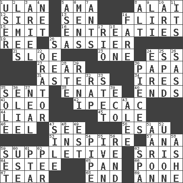 ACROSS 1. Uhlan (variant) 5. Nursemaid (var.) 8. Jai _ 12. The founder of a family 13. Elected rep. 14. Talk or behave amorously 15. Send forth 16. Pleas 19. Portuguese money of account (variant) 20. More lively and spirited 21. _ gin 23. Single 24. Double-curved letter 27. Bring up, as a child 30. Dad 31. Michaelmas daisies 34. Angers 35. Posted 38. Maternal 40. Conclusions 41. Margarine 42. Medicinal drug used to evoke vomiting 44. One who doesn't tell the truth 45. Lacquered or enameled metalware 46. Snakelike fish 47. Perceive with the eye 50. He sold his birthright 53. Motivate 57. Santa ___, CA 59. Supplying deficiencies 63. Indian titles of respect 64. First name in cosmetics 65. Baking dish 66. "Silly old bear" 67. Pull into pieces 68. Conclude 69. Singer Murray DOWN 1. One who uses or employs something 2. Citrus fruits 3. Satellite of Uranus 4. Remaining after all deductions 5. At sea 6. Not women's 7. Pismires 8. The first octave above the treble staff 9. Cards in a Roman deck? 10. "We ___ not amused" (Victoria) 11. ___ a Wonderful Life 14. Conductor's collection 17. River (Sp.) 18. Car or cant ending 20. Perceives with the eye 22. Speaker 24. Merit 25. Hurried 26. Backtalk 28. Had dinner 29. Painter Guido (1575-1642) 30. Parts 32. Hit sharply and swiftly 33. Proofreading order 35. Flatfish 36. Writer Wiesel 37. Be tempered by heat 39. Environmental prefix 43. Toward shelter 47. Filth; sediment 48. Compass dir. 49. Eastern Standard Time (abbr.) 51. Composer Copland 52. The state of being joined or united 54. Corncob 55. _ the terrible 56. Tear apart 58. American tennis player Robert 59. Arrange properly for use 60. Purpose 61. Parent Teacher Assoc. 62. For each 63. Health resort