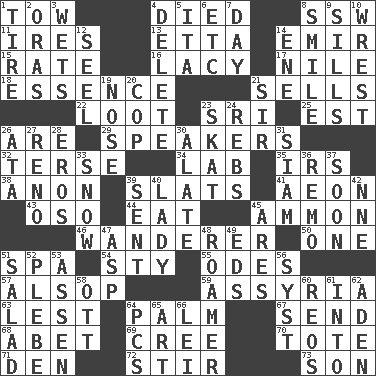ACROSS 1. Pull behind 4. Passed on 8. Compass dir. 11. Angers 13. Singer James 14. Arab leader 15. Assign a rank or rating to 16. Made of lace 17. Mediterranean tributary 18. Substance 21. Makes a sale 22. Plunder 23. _ Lanka 25. Eastern Standard Time (abbr.) 26. "We ___ not amused" (Victoria) 29. Orators 32. Laconic 34. Experiment locale 35. Big collection agency 38. Soon (poet.) 39. Narrow boards 41. Period of immesurable duration 43. Bear (Spanish) 44. Erode 45. ID or VA city 46. Roamer 50. Single 51. Health resort 54. Filthy place 55. Lyric poems 57. Columnist Joseph or Stewart 59. Nineveh was its capital 63. For fear that 64. Inside of hand 67. Transmit 68. Collude with 69. Algonquian 70. Lug 71. Lair 72. Use a spoon 73. Boy, to dad DOWN 1. Hoop that covers a wheel 2. Mouths or openings 3. Moistens 4. Erase 5. Call ___ day 6. And so on (abbr.) 7. 24 hours 8. Grin 9. Beverly of Met fame 10. Obtain by seizing forcibly or violently 12. Sew up the eyelids of hawks and falcons 14. Compass dir. 19. Olfactory organ 20. Police officer (slang) 21. Title for a knight 23. Three-handed card game 24. Confederate soldiers (slang) 26. "One Day ___ Time" 27. Former U.S. Attorney General Janet 28. Greek god of love 30. Having winglike extensions 31. Thailand, formerly 33. Frozen precipitation 36. San ____ (Riviera town) 37. Within a short period 39. Emitted 40. Kenny Rogers chart-topper in '80 42. Compass dir. 45. Ancient Greek god of war 47. Cleo's killer 48. Nomad 49. Begley and Asner 51. Vegetable dish 52. First-year military academy student 53. NE Netherlands city 56. System (abbr.) 58. Baseball player Mel 60. Vintage cars 61. To the inside or interior of 62. An important port of Yemen 64. Personal Computers (abbr.) 65. Tate display 66. Luau accessory