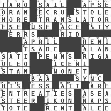 ACROSS 1. Pacific island yam 5. Travel by water 9. Domed church section 13. Northwest Algerian city 14. Shade of tan 15. Took without asking 16. Greater amount 17. Interpreter 19. Compass dir. 20. Purpose 21. Adept person 22. Filthy place 23. Blunders 25. To free from 26. Showery time 30. Painter Guido (1575-1642) 34. Sadhe (variant) 35. ____ Jay Lerner 36. Suttee (variant) 39. Actor Sean's family 42. Port city in Latvia 43. Margarine 44. Ancient Celtic tribe of eastern Britain 46. Comedian Laurel of Laurel & Hardy 47. Music written for nine 48. Sound made by sheep 51. Synchronize (abbr.) 54. Part of HMS, perhaps 57. Curvy letter 58. Small island 60. "We ___ not amused" (Victoria) 62. Pleas 65. Toward the sea 66. Navigate 67. Visual representation of an object 68. Atlas contents 69. Carry 70. Monthly bill 71. Toward shelter DOWN 1. Heavy book 2. Came up 3. More uncommon 4. Single 5. Arranges properly for use 6. 1/640 square mile 7. Retirement account (abbr.) 8. Type of eclipse 9. _ moment's notice (2 wds.) 10. Plant holders 11. Groove 12. Suggestive of the supernatural 15. Downhill vehicle 18. _-fi 20. United States Postal Service (abbr.) 24. Food allowance for one day 27. Strike 28. Binary compound 29. Soviet premier 1918-24 30. Noteworthy scarcity 31. Biblical high priest 32. Tired old horse 33. _ tizzy (2 wds.) 36. Distress signal 37. The first octave above the treble staff 38. Beverage made from leaves 40. Non-commissioned officer (abbr.) 41. Elected rep. 45. A home for chicks 48. Fermented drink made from hops 49. White ___ sheet 50. Moving or stirring 52. Rhinal 53. Streamer paper 54. Command 55. To the inside or interior of 56. Proofreading order 58. Period of immesurable duration 59. Is not 61. Relaxation 63. Portuguese money of account (variant) 64. D.D.E's nickname 65. Nanny (var.)
