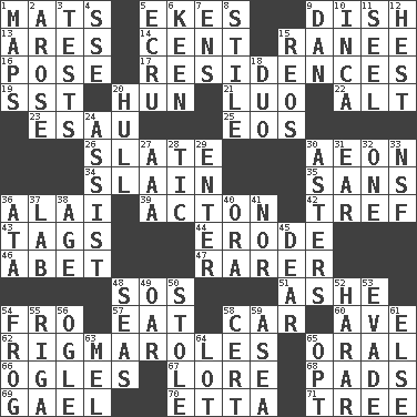 ACROSS 1. Floor coverings 5. Makes supply last 9. Food container 13. Ancient Greek god of war 14. Penny 15. The wife of a rajah (variant) 16. Airs 17. Homes 19. Fast jet (abbr.) 20. Attila the _ 21. Nilotic language 22. The first octave above the treble staff 23. Son of Isaac 25. Greek goddess of the dawn 26. Schedule 30. Period of immesurable duration 34. Killed 35. Without 36. Mountain range southwest of Kyrgyzstan 39. 13-14th century defensive garment 42. Not kosher 43. Labels 44. Wear away 46. Collude with 47. More valued for its uncommonness 48. Mayday 51. American tennis player Robert 54. Back 57. Ingest 58. 4-wheeled motor vehicle 60. "___ Maria" 62. Complicated, petty procedures 65. Taken by mouth 66. Stares at amorously 67. Old wives' tales, e.g. 68. Groovy apts. 69. Highlander 70. Singer James 71. Woody plant DOWN 1. Atlas contents 2. Came up 3. Trials 4. Compass dir. 5. Shade of tan 6. Peachy ____! 7. Followers of ems 8. Vertical member of a panel or frame 9. Daniel's nick name 10. South American Indian 11. Stitch closed the eyes of (a falcon) 12. Command 15. Vintage cars 18. Superhero pair 20. Frame or body of a ship 24. Aid 27. American Automobile Association (abbr.) 28. Nervous spasm 29. Keyboard key 30. Michaelmas daisies 31. Ewer handle 32. Single 33. Science/research agcy. 36. _ moment's notice (2 wds.) 37. Experiment locale 38. Personal question 40. Mouth or opening 41. Not either 45. Letter starter 48. Oceans 49. Rowing implement 50. Fur scarf 52. Ethiopian city, capital of Harari 53. Dodge 54. Tree-dwelling hopper 55. Port city in Latvia 56. Stare 58. Sure thing 59. At sea 61. Otherwise 63. Cartoonist voice _ Blanc 64. Car dealer's back yard 65. Elect