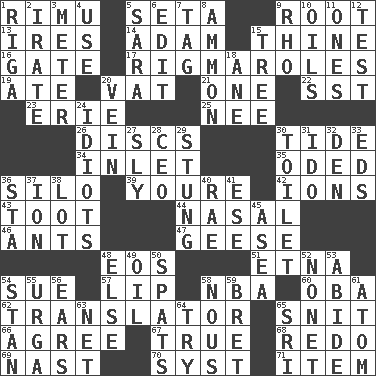 ACROSS 1. Tall New Zealand timber tree 5. Bristle 9. Carrot, for example 13. Angers 14. First of billions? 15. One or ones belonging to thee 16. Yard entry 17. Complicated, petty procedures 19. Had dinner 20. Large container 21. Single 22. Fast jet (abbr.) 23. One of the Great Lakes 25. Born 26. Plates 30. Event that recurs at intervals 34. An arm off of a larger body of water 35. Wrote a lyric poem 36. Grain storage tower 39. You are 42. Charged particles 43. A blast of a horn 44. Relating to the nose 46. Pismires 47. Honkers 48. Greek goddess of the dawn 51. Inactive volcano in Sicily 54. Take to court 57. Mouth edge 58. Basketball assoc. 60. Chief or king in Benin or Nigeria 62. Interpreter 65. In a ____ (agitated or irritated) 66. Match 67. Loyal 68. Redecorate 69. Political cartoonist Thomas 70. System (abbr.) 71. A distinct part DOWN 1. Capital of Latvia 2. Feeling or showing extreme anger 3. Distance measurement 4. Purpose 5. "Two Mules for Sister ____" 6. Prepare for publication 7. Label 8. ID or VA city 9. 17th letter of the Greek alphabet 10. Petroleums 11. Singles 12. Trial 15. Woody plant 18. One (Scot) 20. Distinctive style or manner 24. Foolish or stupid persons 27. Mischievous 28. Corporate head (abbr.) 29. Feeling sharp psychological pain 30. Bathroom plumbing fixture 31. Wedding promise 32. Lair 33. Begley and Asner 36. R.R. building 37. Electrically charged atom 38. Car dealer's back yard 40. Actress Charlotte 41. Compass dir. 45. At sea 48. Otherwise 49. Lubricate 50. Arguments over trivial matters 52. Music written for nine 53. Stay 54. Comedian Laurel of Laurel & Hardy 55. Capital and largest city of Mongolia 56. Hearing organs 58. Horse sense 59. Cy Young winner Saberhagen 61. Tiny particle 63. Fish or hair follower 64. Attempt 65. Indian title of respect (Mr.)